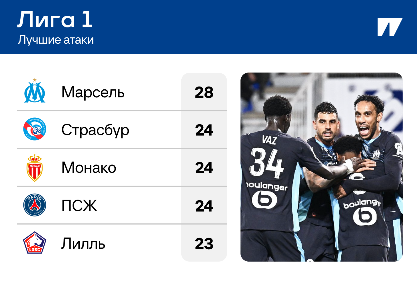 Другое дело – «Марсель» с пятью крупными победами, тут уже было и 5:2 над «Парижем», и 6:2 над «Гавром». Все хорошо с атакой, так что и «ПСЖ» далеко не отпустили – в двух очках.
