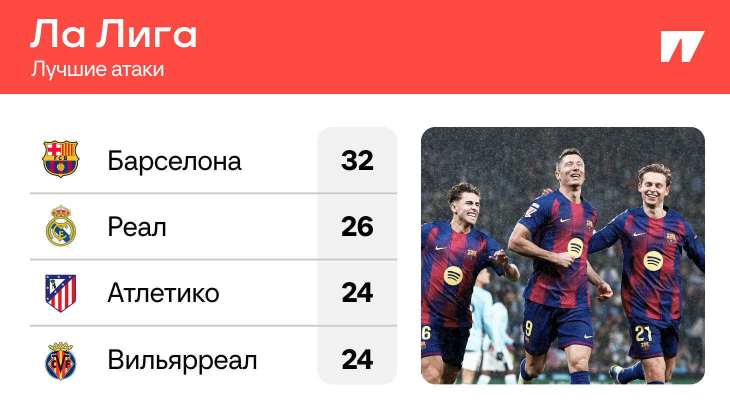 Дальше – «Атлетико», который забил всем, а самая принципиальная игра была и самой результативной – 5:2 над «Реалом». Здесь же и «Вильярреал», который не сумел отличиться только в матче с «Атлетико», а хорошему показателю по голам точно помогли 5:0 над «Жироной» и 4:0 над «Райо».