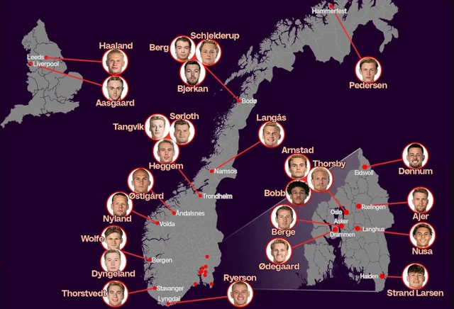 А вот как на карте выглядит место рождения основных игроков сборной, приложивших ногу к успеху Норвегии в отборе.