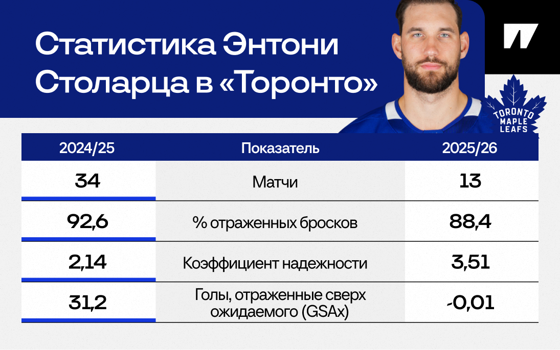 Этой осенью все сразу пошло не так. Уолл на месяц покинул клуб из-за семейных обстоятельств, а Столарц не справился с большей нагрузкой. Ошибся и менеджмент: Треливинг для помощи основному вратарю взял с драфта отказов Кэйдена Примо, который провалился в прошлом сезоне в «Монреале» (83,6% ОБ в 11 матчах) и ожидаемо не потянул сейчас в «Торонто» (83,8% ОБ за 3 игры).