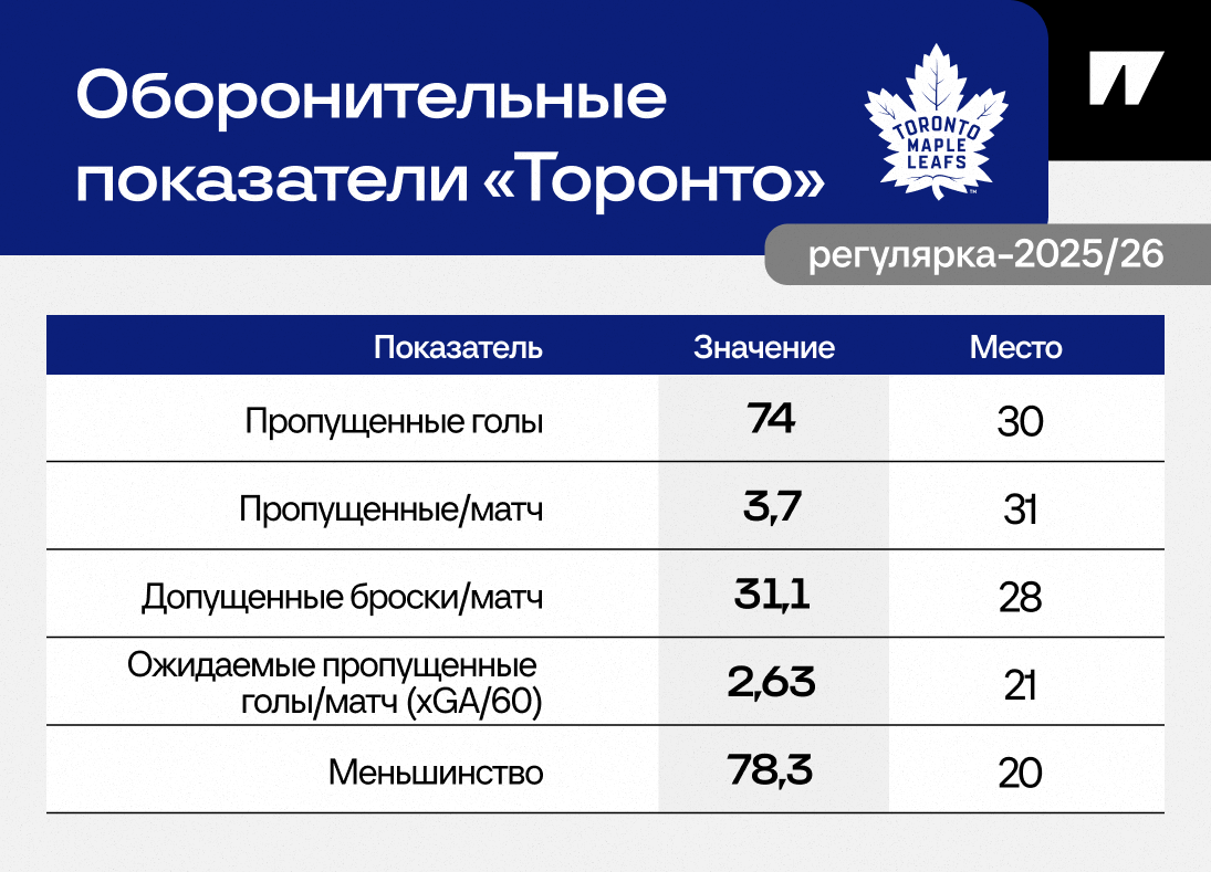 Проблемы конфигурации состава видны и в защите «Торонто». По всем основным оборонительным показателям «Лифс» выглядят скорее как перестроечная команда, а не как претендент на Кубок Стэнли.