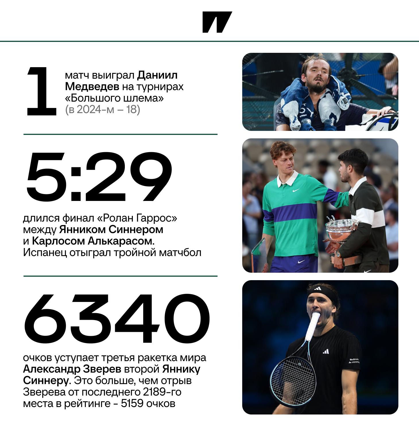 5 часов 29 минут длился финал «Ролан Гаррос» между Синнером и Карлосом Алькарасом. Это самый продолжительный финал грунтового «Шлема».
