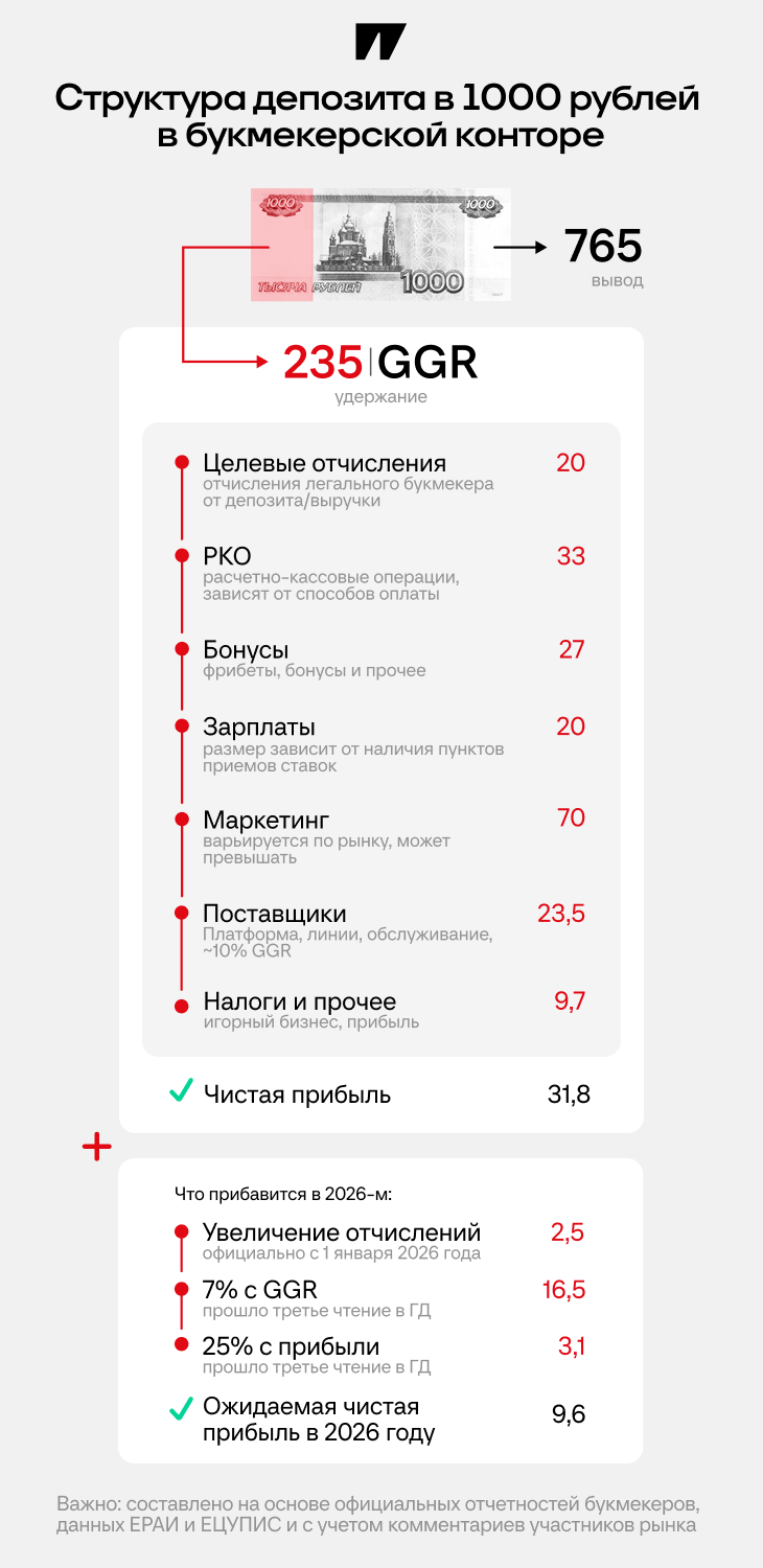 С 1 января появится два новых налога – на валовый игровой доход (GGR, как раз те самые 235 рублей с 1000) и на прибыль. Считаем, сколько еще вытащат из каждой тысячи: 1,65% – налог на GGR, 0,3% – налог на прибыль. Вдобавок на 0,25% вырастут целевые отчисления. Итого вместо 31,8 рубля с каждой тысячи у букмекера останется 9,6 рубля.