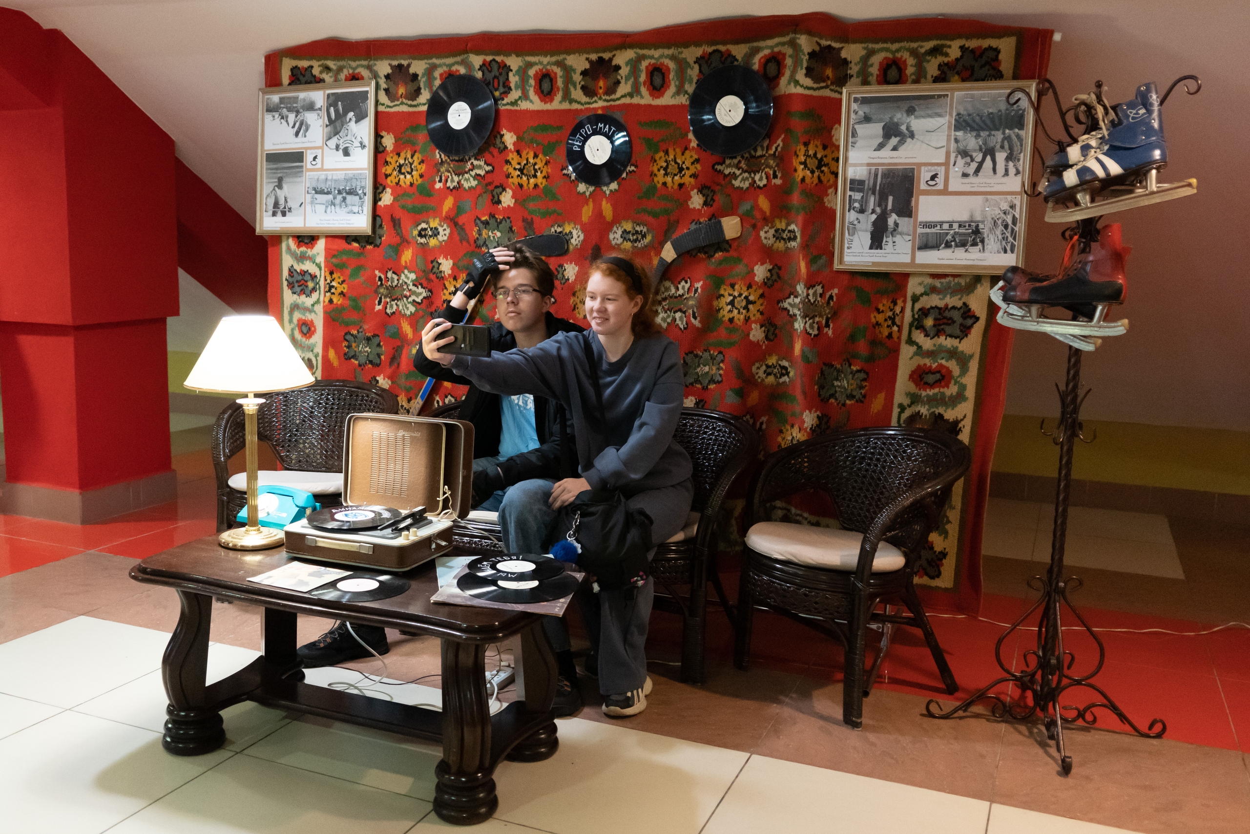 Сюрпризом для гостей ретро-матча стала тематическая фотозона: винтажный ковёр с архивными снимками бобруйских хоккеистов, пластинки, коньки и клюшки, патефон, настольная лампа и дисковый телефон. Кинокомпания «Бобруйсккино» предоставила для выставки кинотехнику 80-х годов. Получились очень атмосферные кадры!