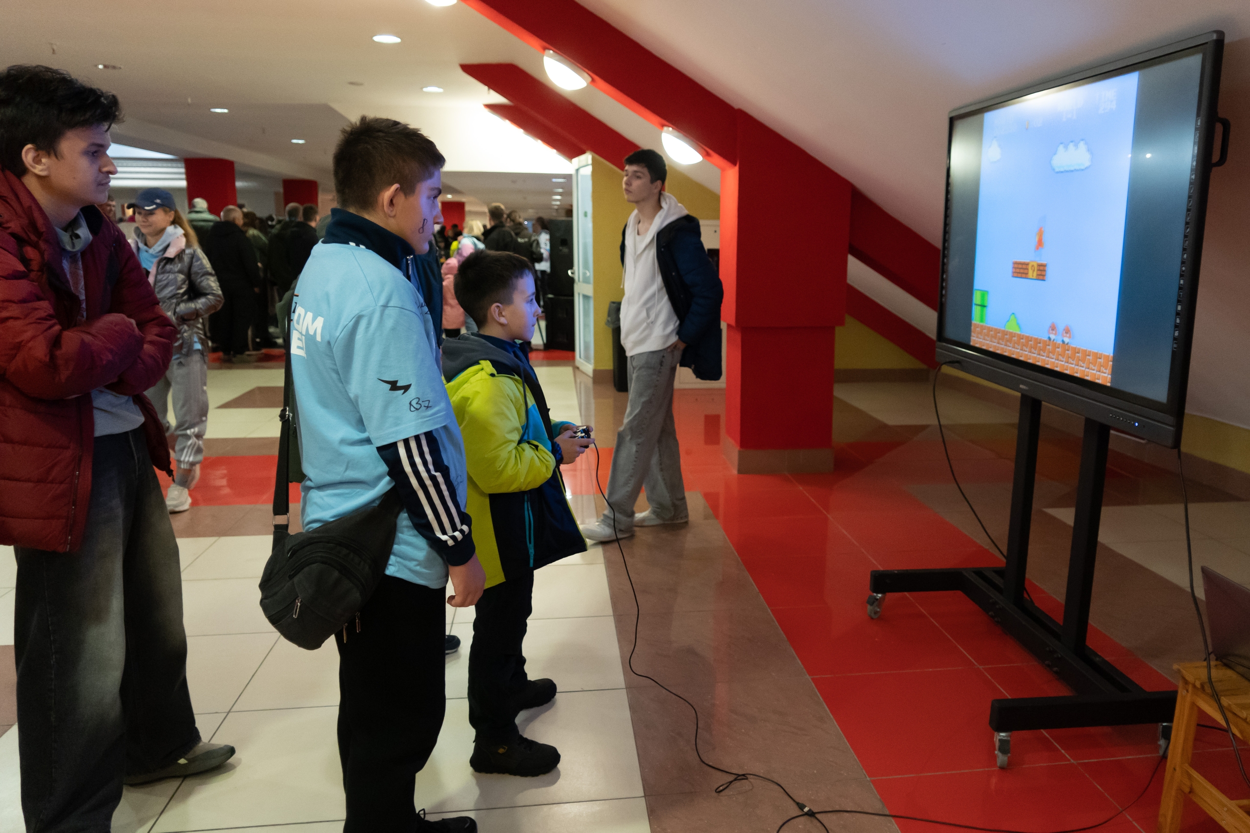 Какое погружение в прошлое без музыки? В паузах на «Бобруйск-Арене» играли главные хиты 80-х и 90-х в исполнении группы «Руки Вверх!», Шуры, Boney M. В фойе для всех желающих работала игровая консоль «Dendy», на которой можно было поностальгировать и сыграть в Super Mario.