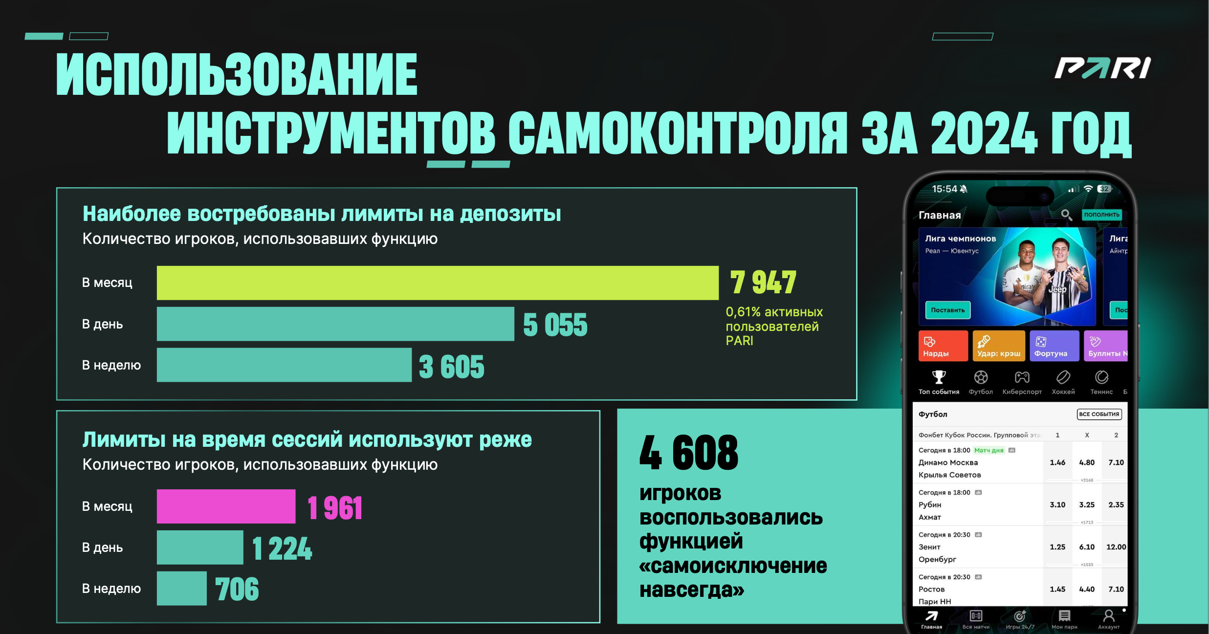За 2024 год более 4,6 тысяч клиентов (0,35% от активных игроков) навсегда запретили себе делать ставки. Около 8 тысяч бетторов использовали месячный лимит на депозиты – эта функция популярнее дневных и недельных ограничений.