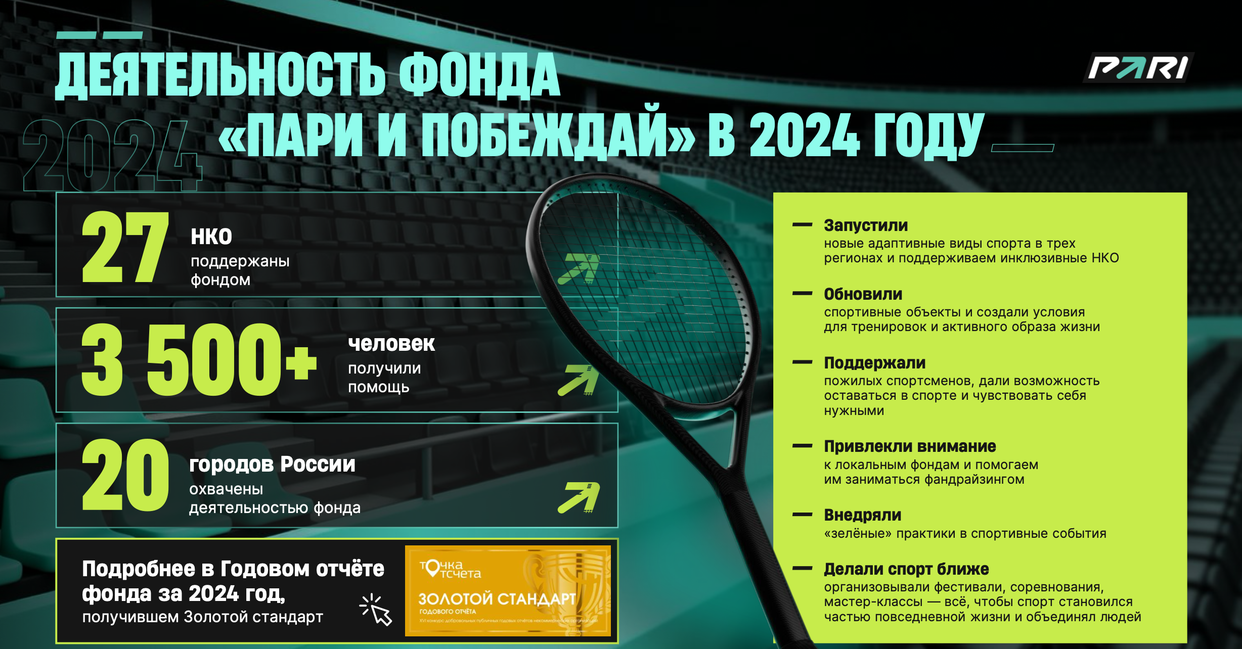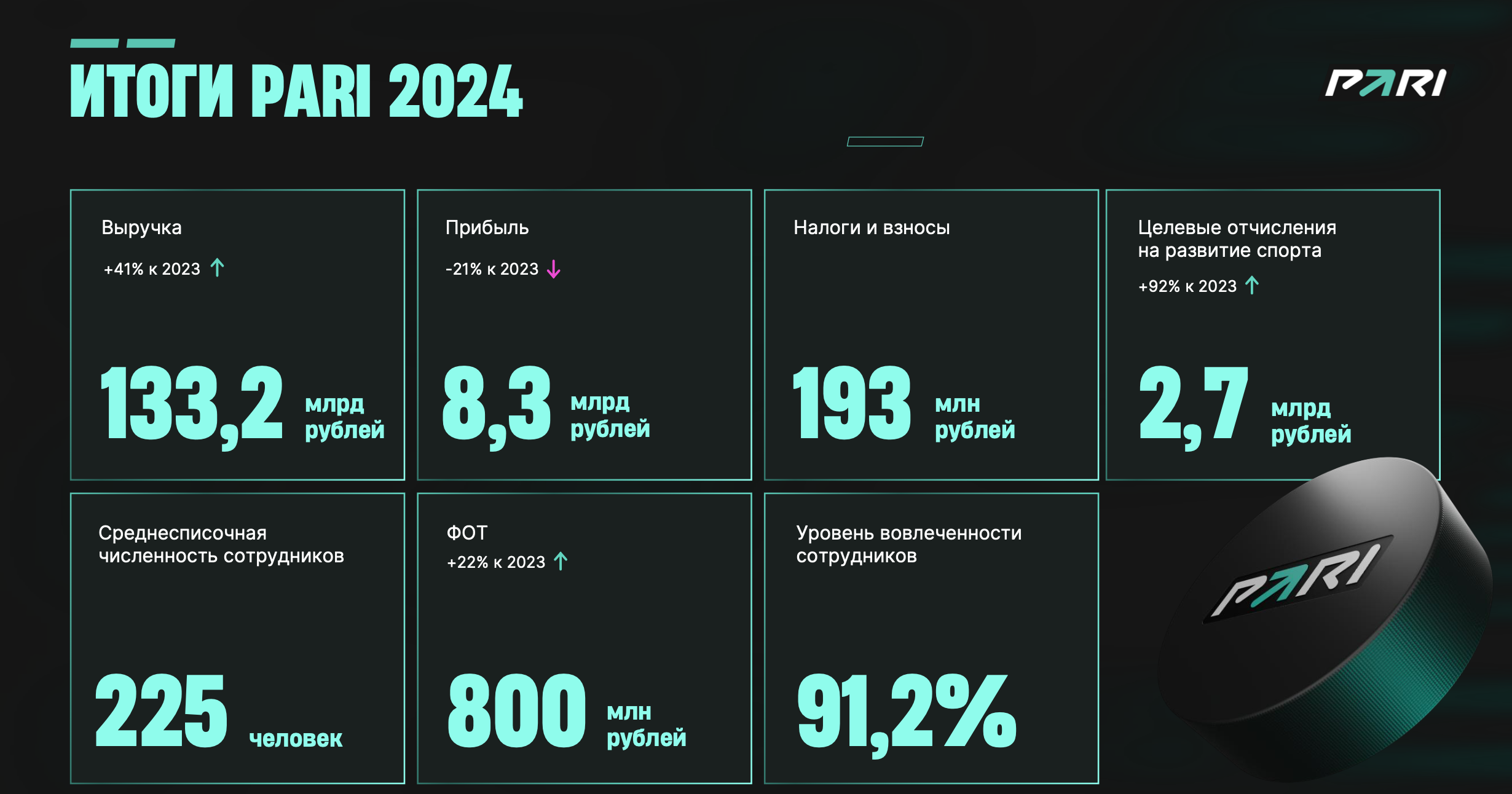 В отчетном 2024 году PARI выделил 2,7 млрд рублей целевых отчислений на развитие российского спорта, а также создал благотворительный фонд «Пари и побеждай».