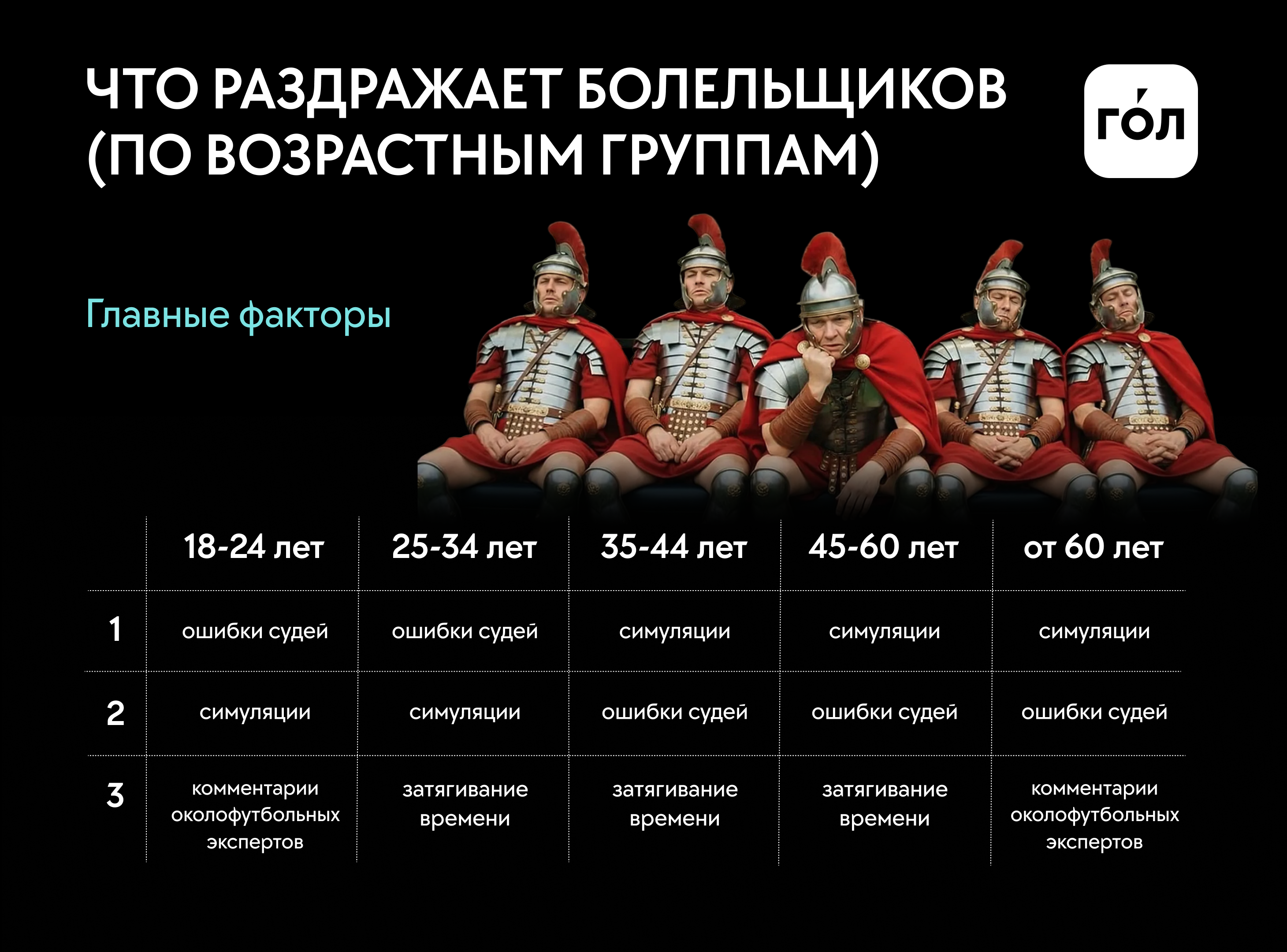 В среднем возрасте раздражает лимит на легионеров, а в старшем – их количество. Плохая атмосфера не нравится молодежи, поколению 60+ надоел ВАР