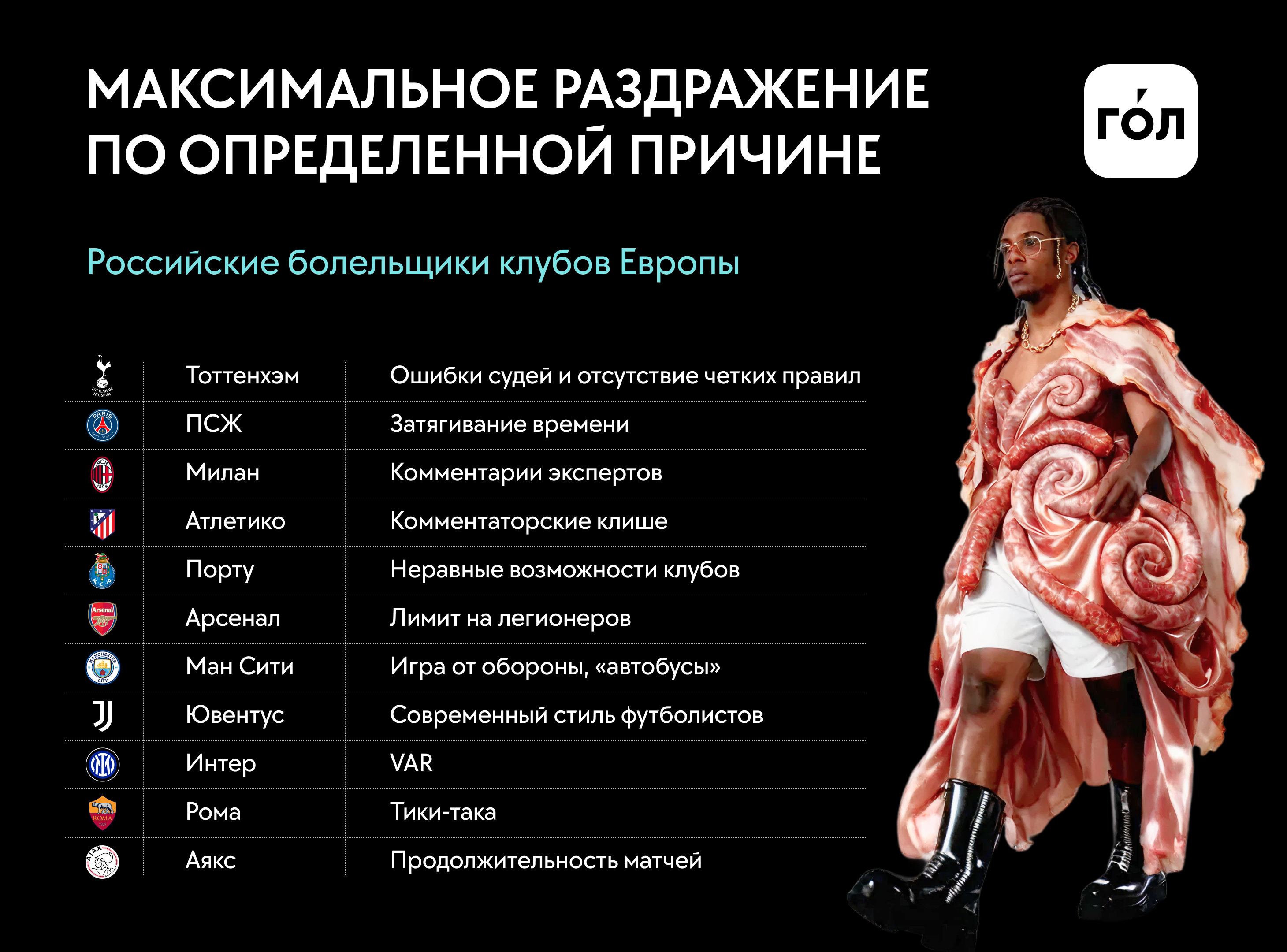 Фанатов 11 команд пункт с ошибками судей раздражает больше остальных, еще у двух – делит первое место. «Людей всегда бесит работа судей, – комментирует исследование ГОЛа бывший арбитр и эксперт Сергей Лапочкин. – Никто не хочет признавать своих ошибок – проще переложить на другого. Никто не говорит, что тренер плохо отработал, а футболист – не забил с метра.