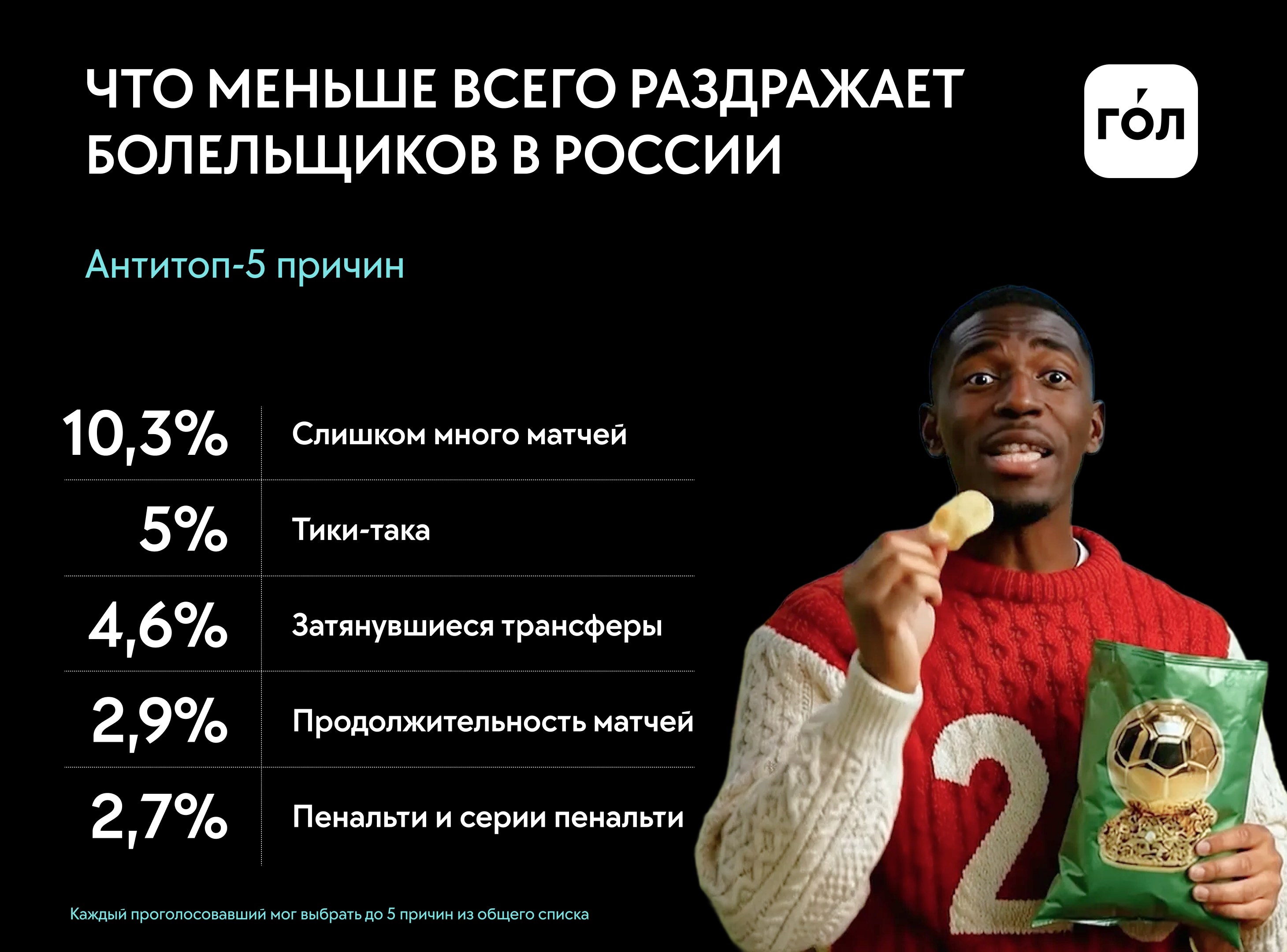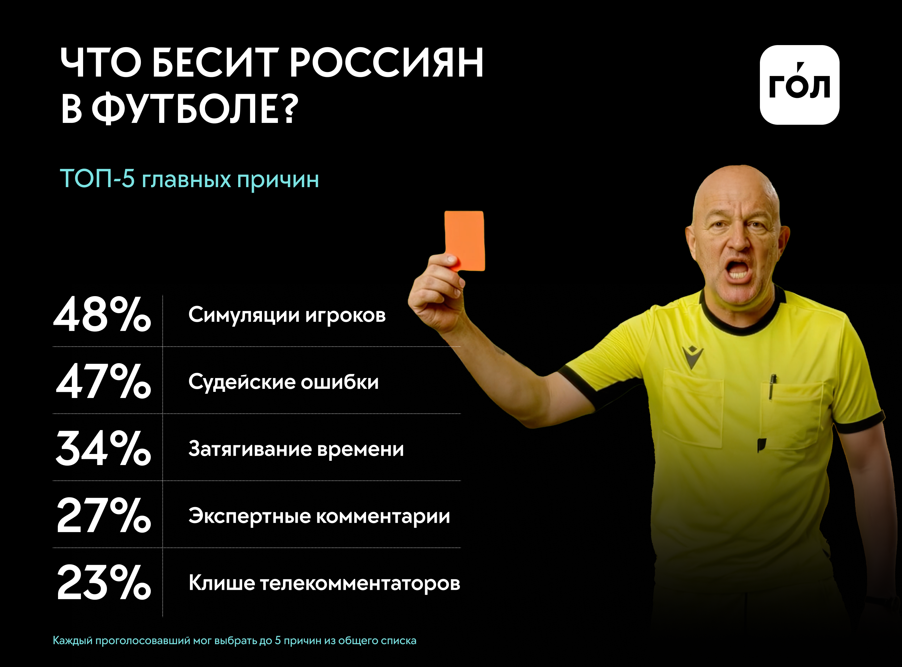 Изначально более 550 человек ответили, что их раздражает в современном футболе и вокруг него. Далее по этим критериям проголосовали более 1550 респондентов, которые увлекаются футболом. Так была сформирована общая статистика.