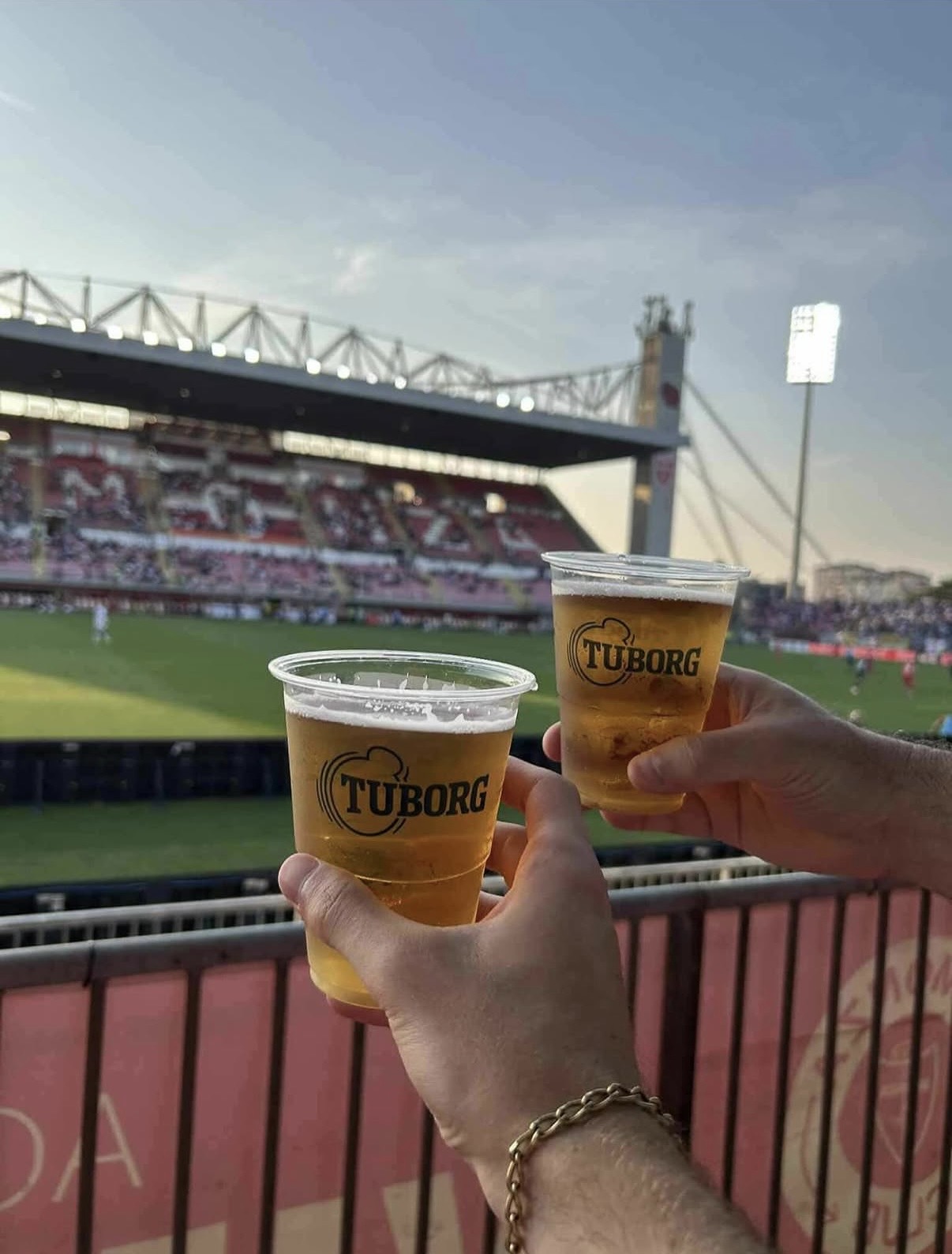 С атмосферой на стадионе тоже полный порядок: пивко в толстенных стеклянных кружках и шашлычок с соленым огурчиком.