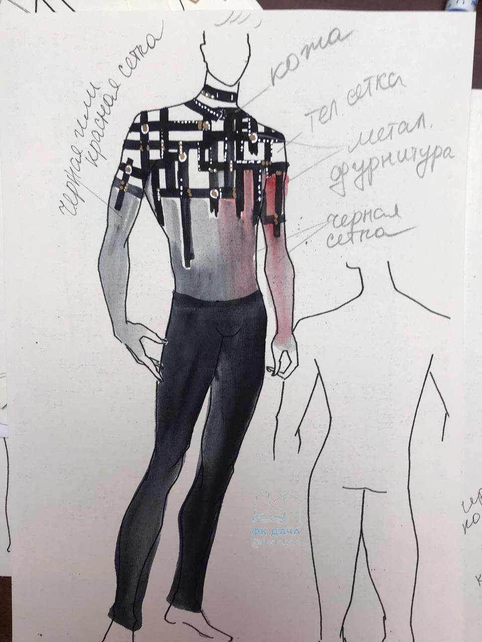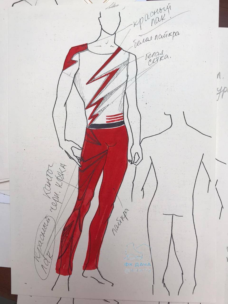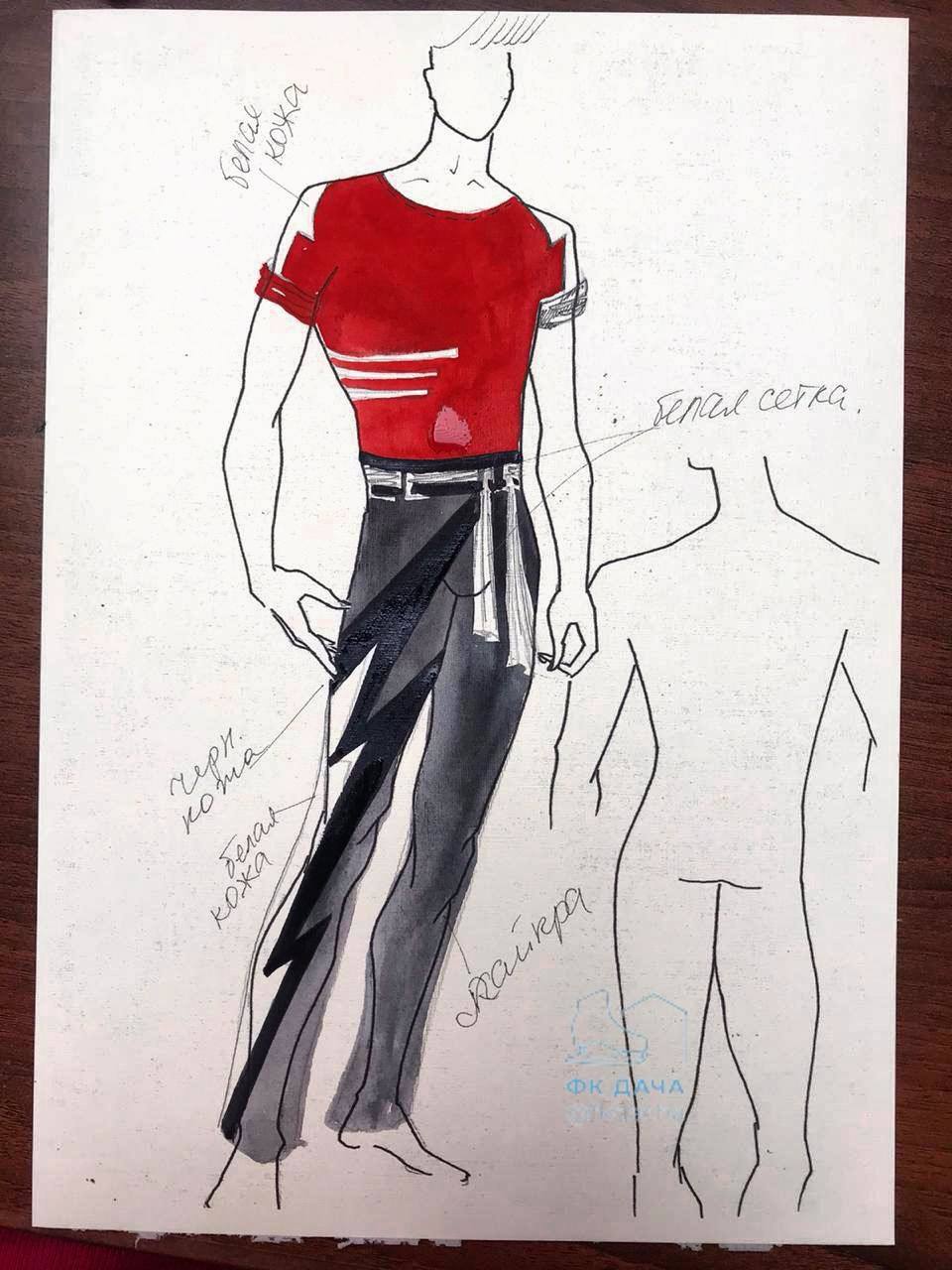 Изначально было у нас три эскиза, и мы выбрали, я думаю, вы уже знаете, какой костюм. И фотографии также вот такие были с примерки.