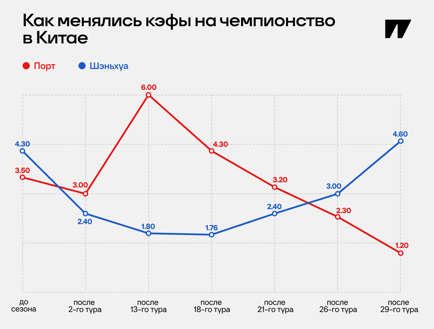 На старте видели «Порт» главным претендентом, а «Шэньхуа» котировался вторым. Котировки начали смещаться уже через два тура: команда Слуцкого стала главным фаворитом. Здесь близость к трофею = как можно более низкая точка.
