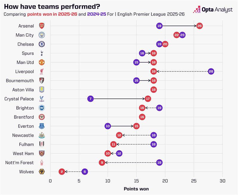 Три команды сделали серьезный буст относительно прошлого сезона: «Арсенал» набрал на 7 очков больше, «Кристал Пэлас» – на 10, «Эвертон» – на 5.
