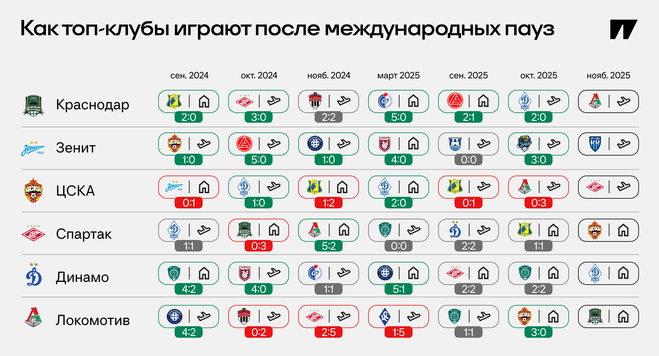 ● ЦСКА за полтора года побеждал только махачкалинское «Динамо». При этом два поражения от «Ростова» – после международных пауз. Получилась беспроигрышная серия от одного матча с южанами дома... до следующего – на выезде. Показателен и разгром от «Локомотива» (0:3). В октябре Карпин также задействовал костяк армейцев против Боливии – во втором матче, а не в первом против Ирана.