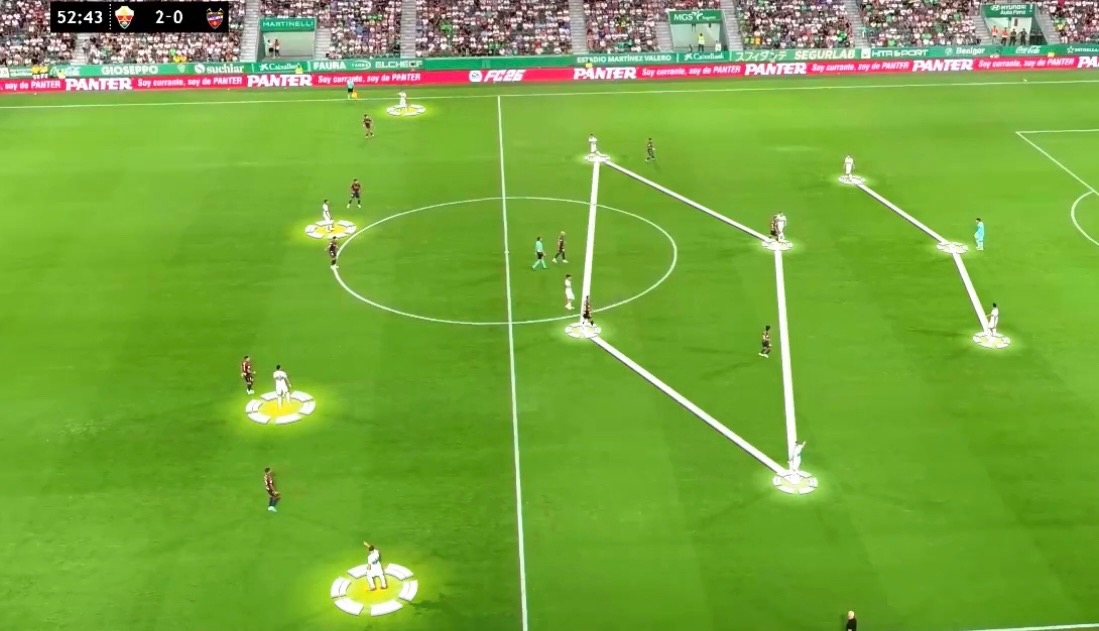 «Эльче» использует классические 4-3-3, но в процессе игры быстро трансформируется в вариации вроде 1-2-3-1-4 или 1-3-2-1-4. Короткие дистанции между линиями и высоко зафиксированные вингеры создают постоянные ориентиры для построения атаки. Именно из этой структуры команда диктует игру, заставляя его подстраиваться под свой ритм.