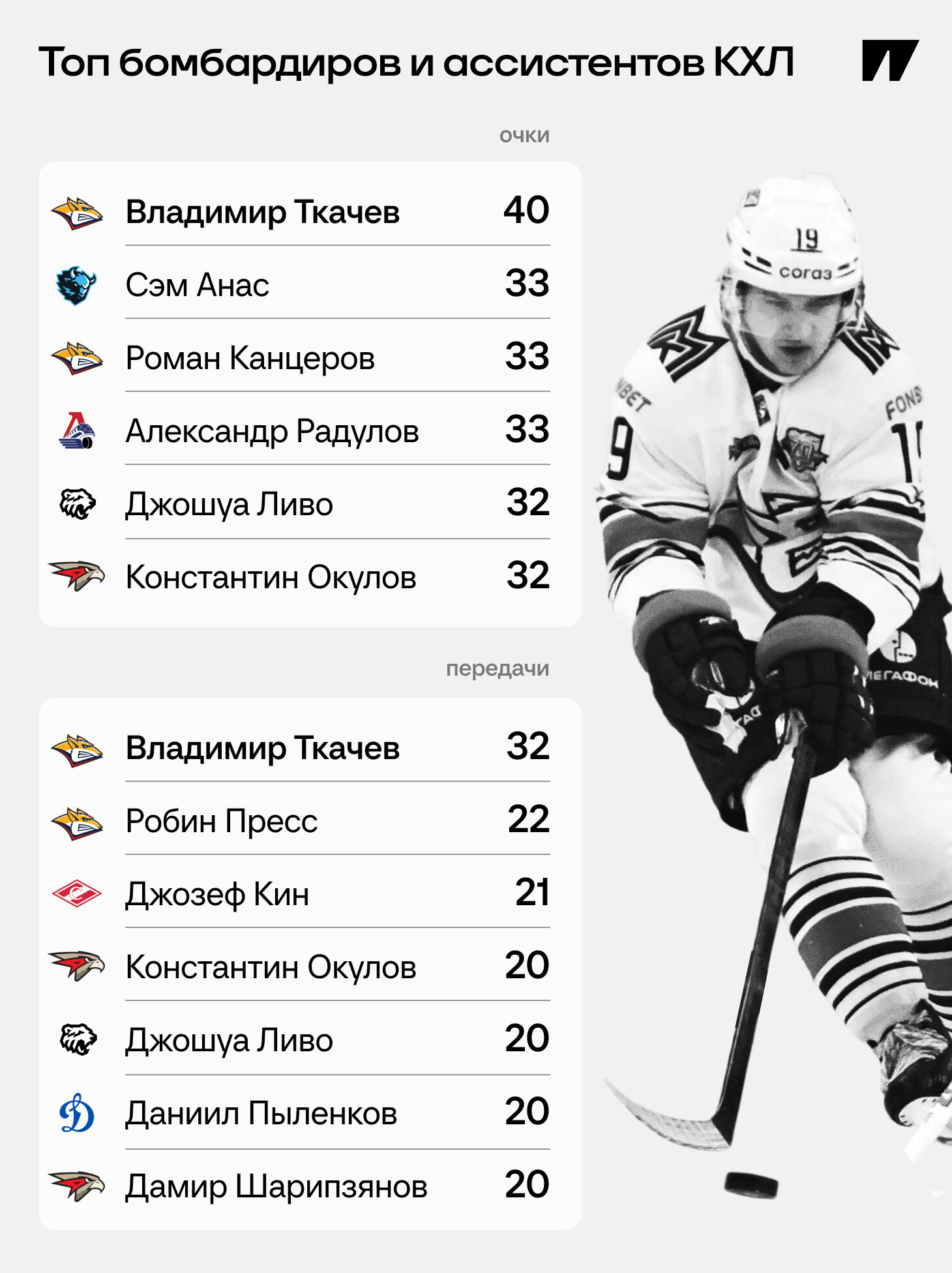 Пока в НХЛ поколение Селебрини и Бедарда бьется за трон с поколением Макдэвида и Маккиннона, которые так и не скинули с пьедестала современности поколение Овечкина и Кросби, в России безраздельно царствует Ткачев. Нападающий «Магнитки» с заметным отрывом лидирует в гонке бомбардиров и с огромным – возглавляет таблицу лучших ассистентов.