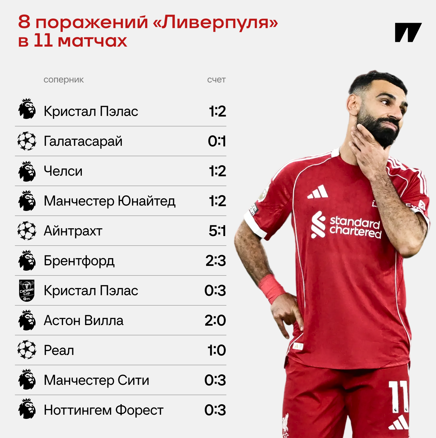 ● Шестое поражение «Ливерпуля» в семи матчах. Причем 0:3 – третий раз подряд. До этого получили от «Кристал Пэлас» и «Сити». На этом отрезке выиграли только у «Астон Виллы». Зато в Лиге чемпионов победили «Реал» (1:0). С учетом ЛЧ это восьмое поражение за 11 матчей.