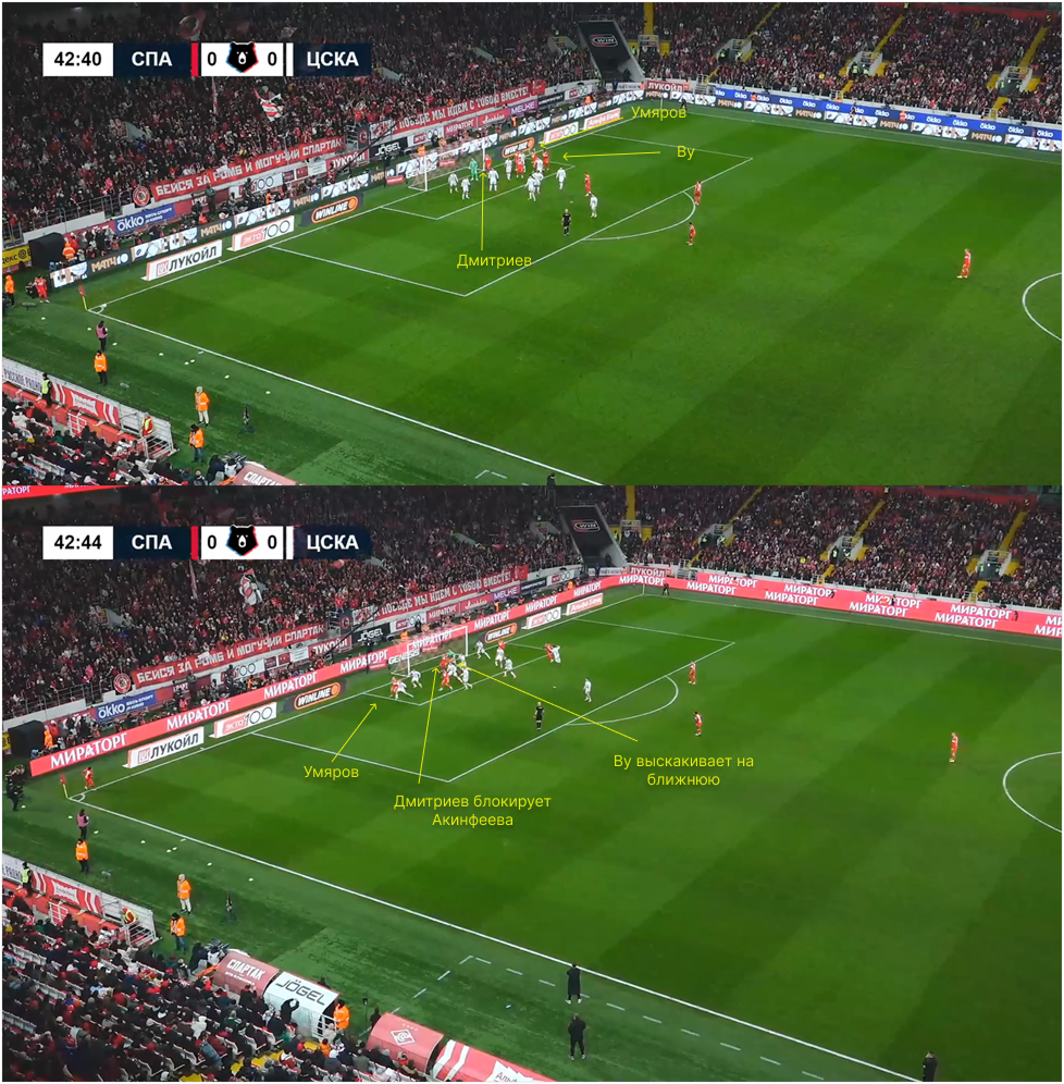 Кстати, победный угловой – копия розыгрыша «Арсенала». У Дмитриева ключевая роль: изначально находился за спиной Игоря Акинфеева. Но затем по дуге выбежал перед ним из-за линии ворот. Возможно, защитник «Спартака» даже не был адресатом. Похоже, Дмитриев должен был блокировать вратаря для Кристофера Ву, он выскакивал на ближнюю.