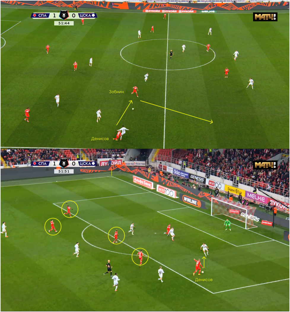 2. Роман Зобнин и Даниил Денисов плотно связали справа. Перед матчем были опасения, что правый фланг «Спартака» рухнет. Но задумка сработала: Зобнин нейтрализовал подключения Мойзеса и не мешал впереди.