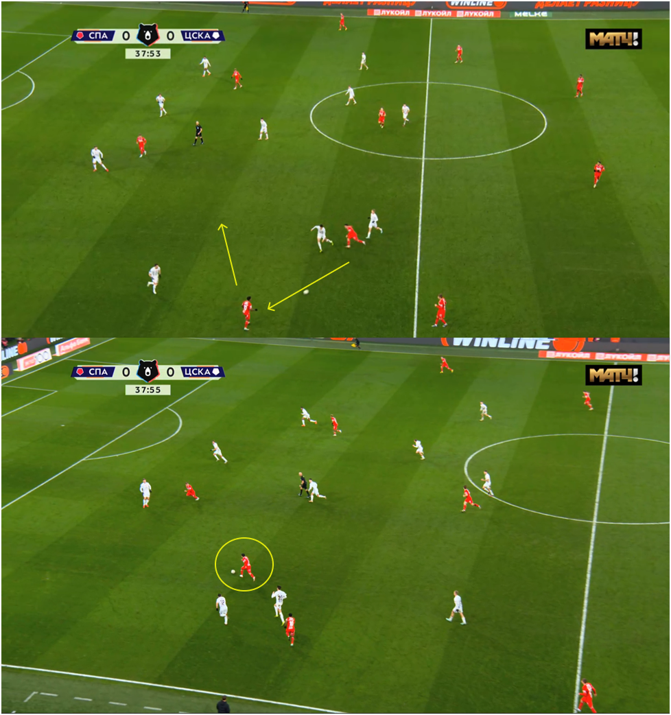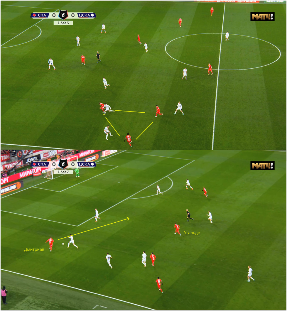 1. Треугольник Эсекиэль Барко – Маркиньос – Игорь Дмитриев. Творили в первом тайме за счет быстрых перепасовок и недоработок вингера ЦСКА Матии Поповича. Обычно разыгрывали на троих, так создали момент для Манфреда Угальде в начале матча.