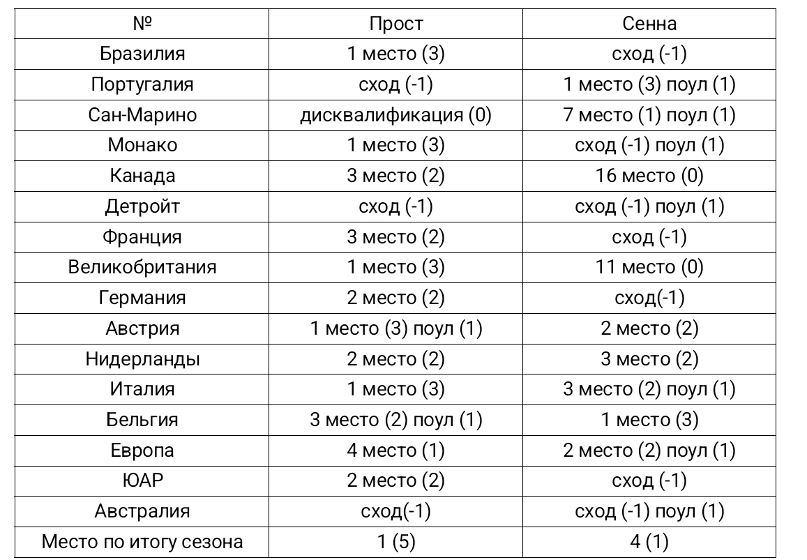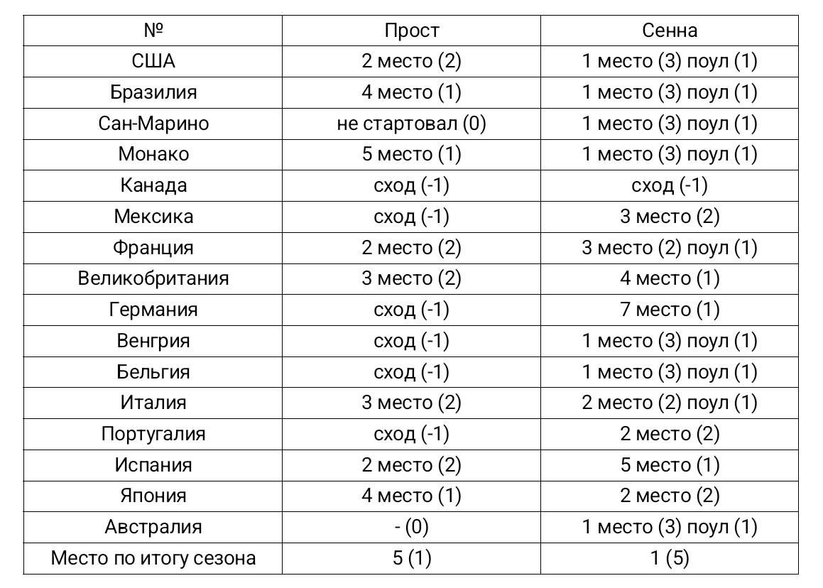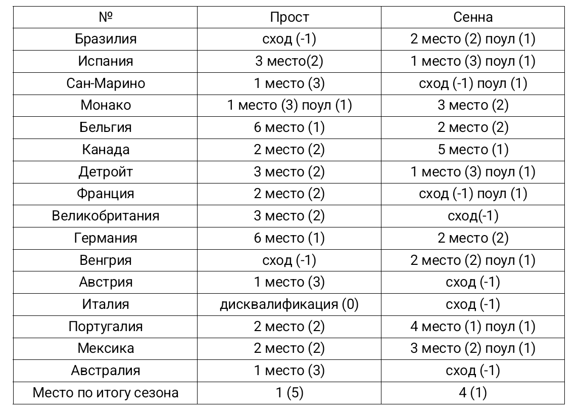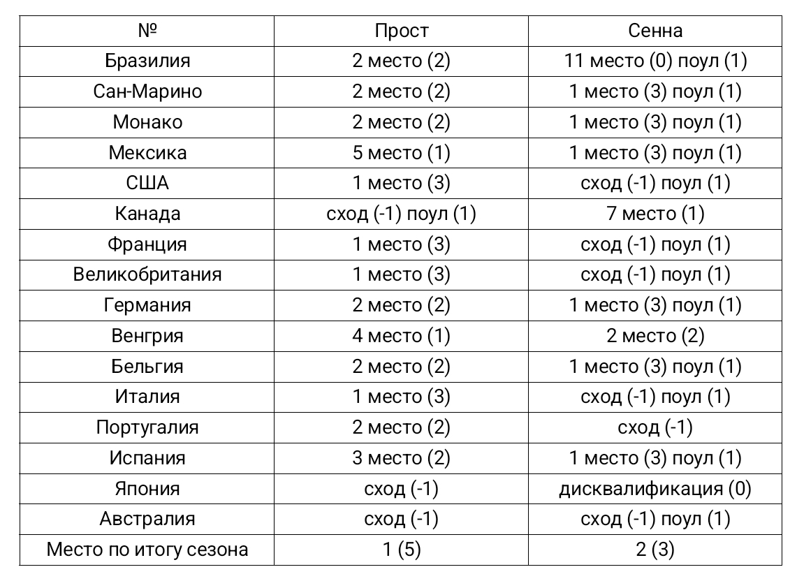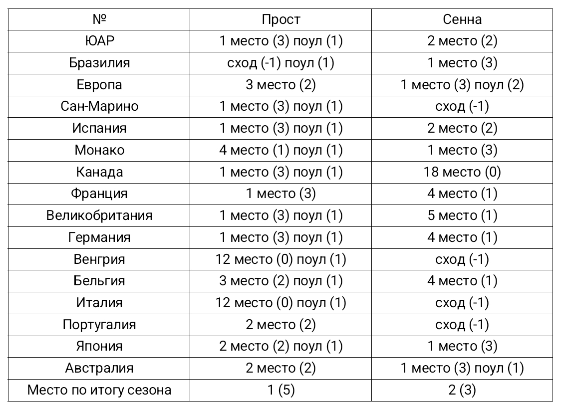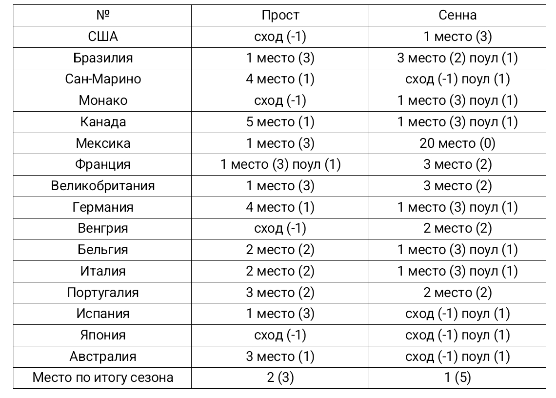 Сенна - 6 первых места (18 очков), 1 раз был на подиуме (2 очка), 1 раз был в десятке (1 очко), 12 раз выиграл поул (12 очков), 2 место по итогу чемпионата (3 очка), 4 схода (-4 очка) = 32 очка.