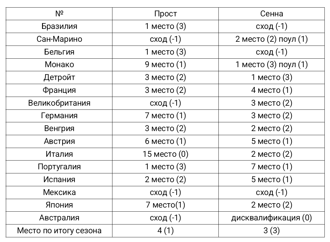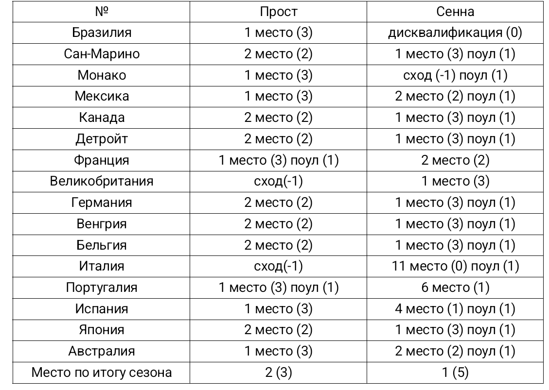 Сенна - 2 первых места (6 очков), 6 раз был на подиуме (12 очков), 4 раза был в десятке (4 очка), 2 раз выиграл поул (2 очка), 3 место по итогу чемпионата (3 очка), 3 сходов (-3 очка) = 24 очка.