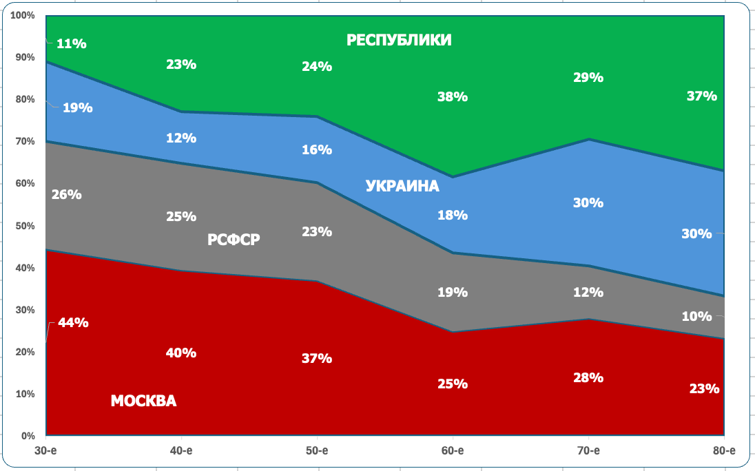 Главными же проигравшими если смотреть всю историю чемпионатов СССР были немосковские команды российских городов. Имея примерно четверть участий в 30-40-х их доля сократилась до 12% в 70-х и до 10% в 80-х, то есть упала более чем вдвое. Это более сильное падение чем у Москвы.