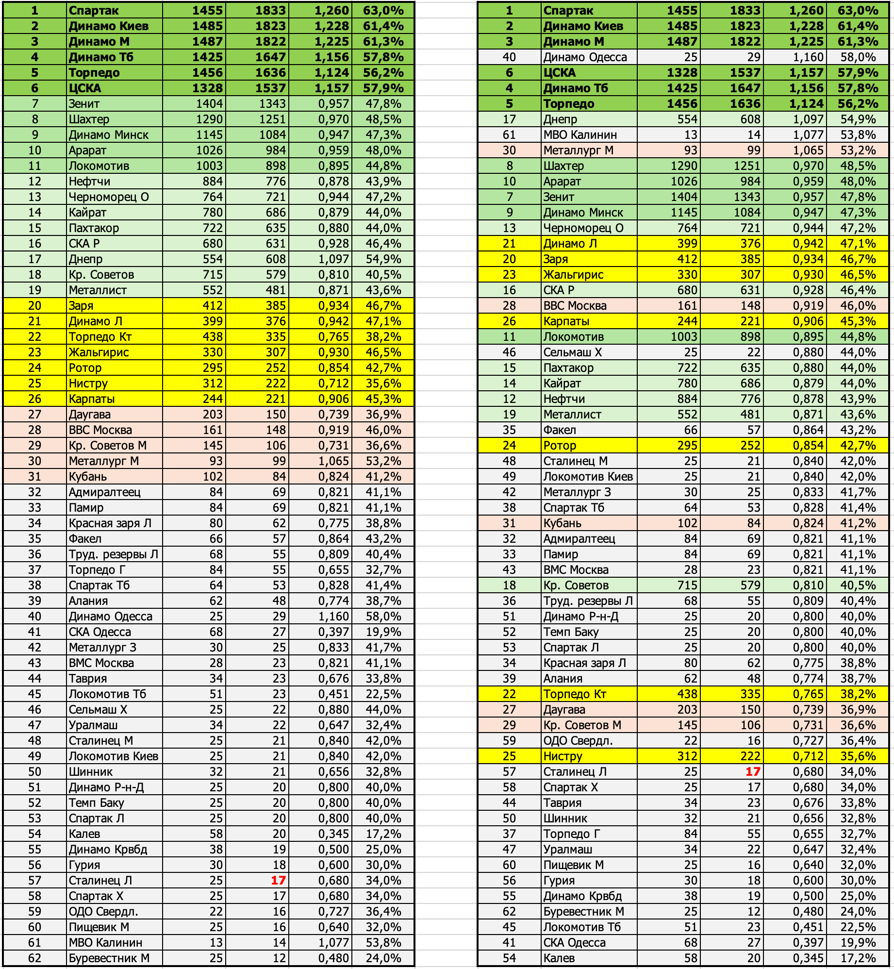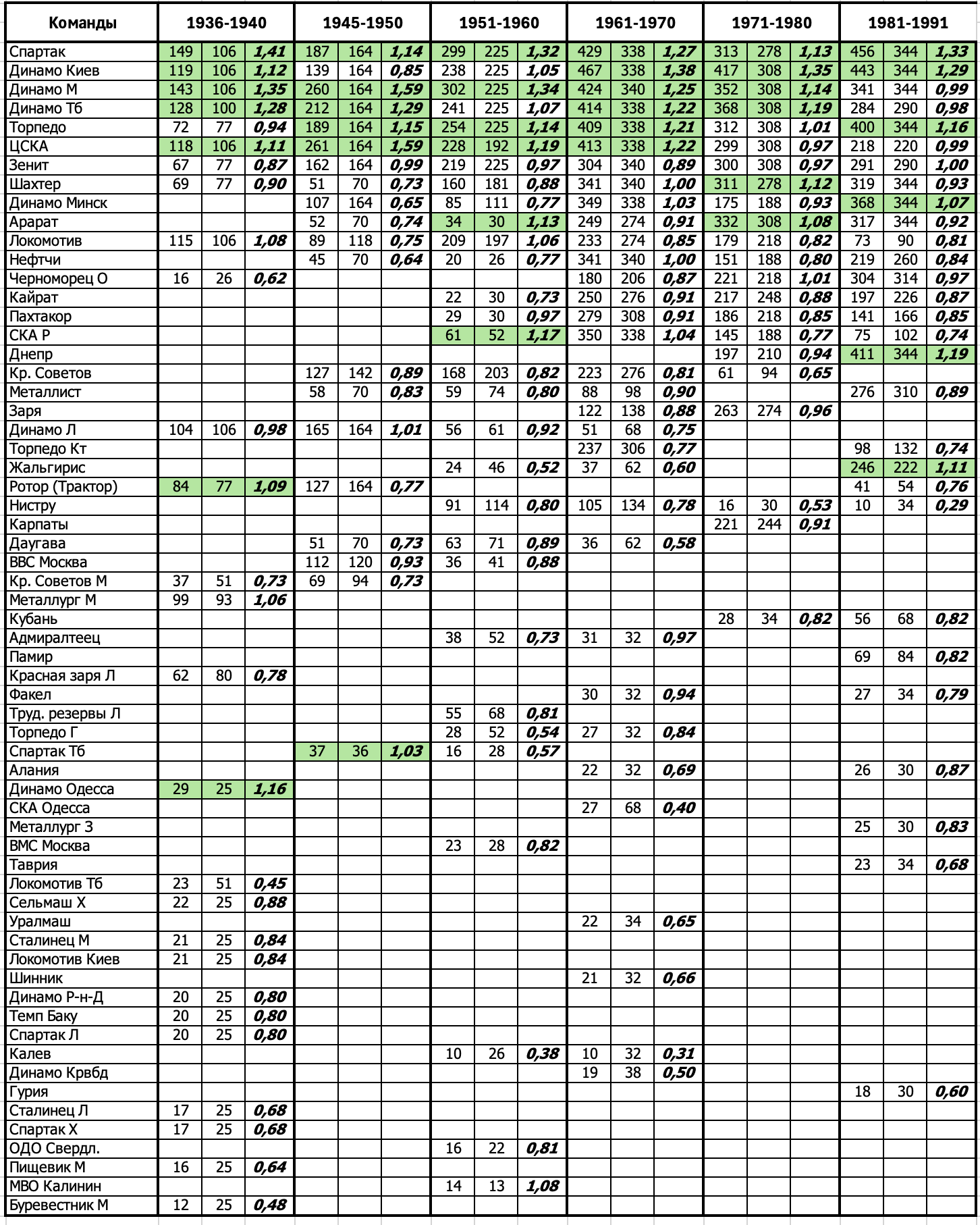 Как и сейчас в АПЛ в СССР была своя большая 6-ка команд которые набрали более 1500 очков и имели в среднем больше 1,15 очка за игру. Из них тоже как в АПЛ можно выделить большую тройку самых титулованных команд (36 титулов из 54 на троих) – Спартак, Динамо К и Динамо М – у которых было более 1800 очков и более 61% набранных очков (более 1.22 за игру). ЦСКА, Тбилиси и Торпедо были чуть послабее – 56-57%. За ними идут еще 5 команд – Зенит, Шахтер, Минск, Ереван и Локомотив – с приличными результатами – от 900 очков – но уже с гораздо меньшей эффективностью – 45-48%. Хорошую эффективность – 55% или 1.1 О/И – демонстрировал Днепр – но он попал в высшую лигу поздно – уже в 70-х – и сыграл не так много как другие топы (но успел взять 2 титула).