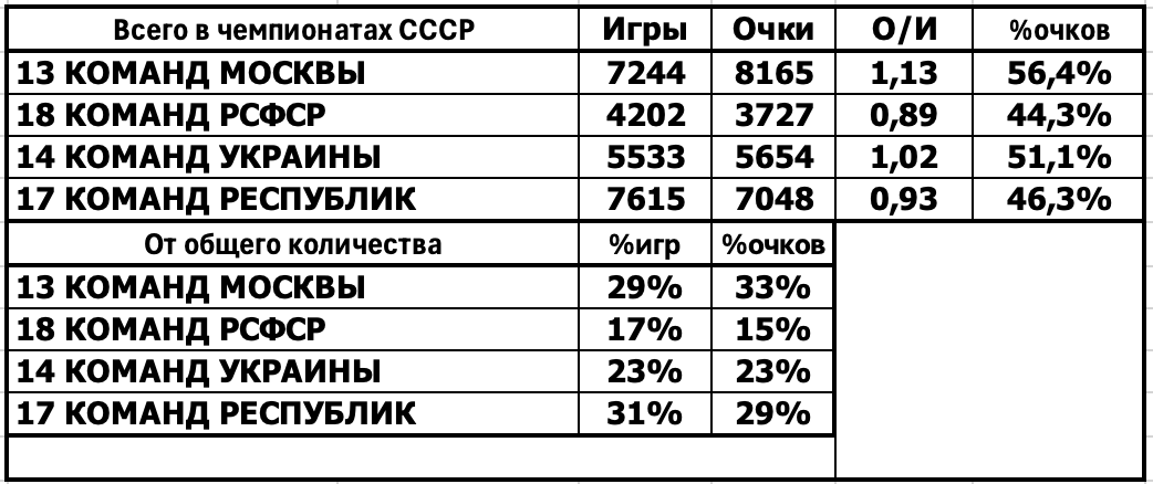 Выяснилось для начала что в Чемпионатах СССР высшей лиги приняло участие 62 команды – ровно половина из которых (31) по удивительному совпадению представляла Россию (РСФСР) и половина союзные республики, которые совместно сыграли 12297 матчей и набрали 24594 очков по двухбальной шкале.
