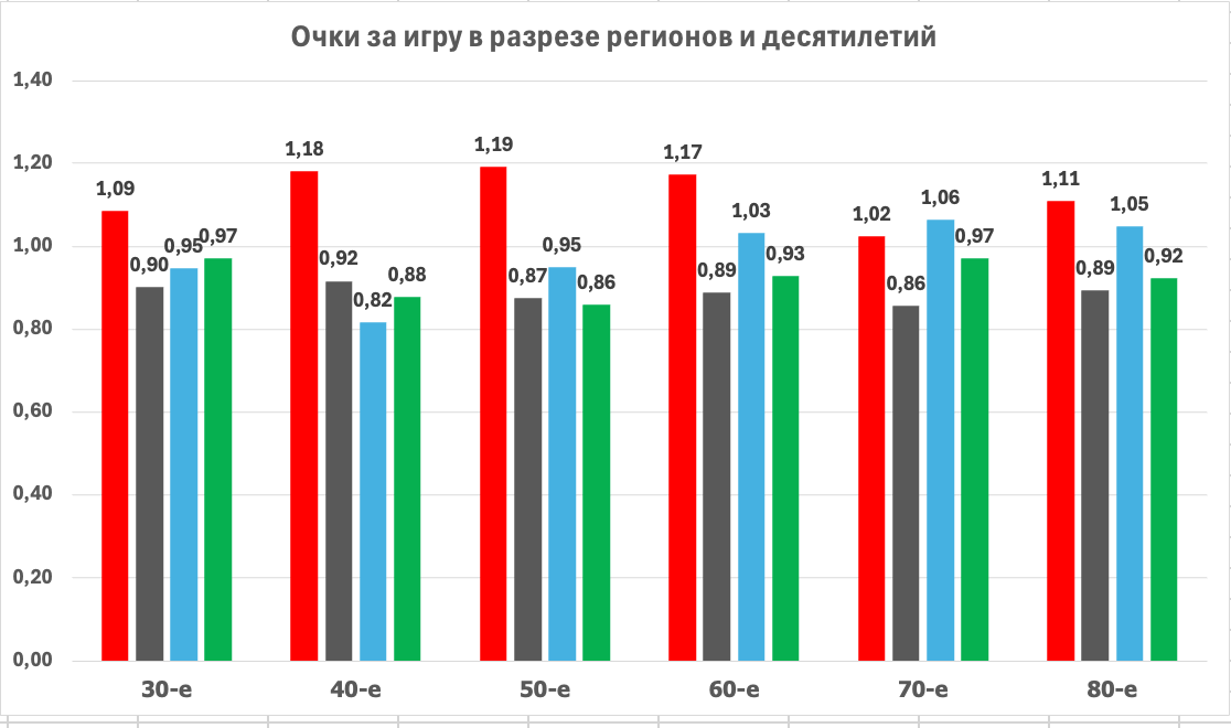 Тут видно что Москва все же старалась держать свой уровень – хотя в 70-х сильно просела и пропустила вперед Украину, но вот у РСФСР и тут все было печально – они медленно дрейфовали с 0,92 до 0,86 – по сути если и попадали в вышку то были там аутсайдерами. В 80-х чуть подросли за счет Зенита который даже смог стать чемпионом и ввиду того что другие команды до вышки просто не добирались. Но в целом они заметно проигрывали по результатам командам нац республик начиная с 60-х (в 40-х было +0,04 в их пользу, в 50-х уже +0,01, а далее минус 0,04 в 60-х, аж минус 0,11 в 70-х, и минус 0,03 в 80-х.