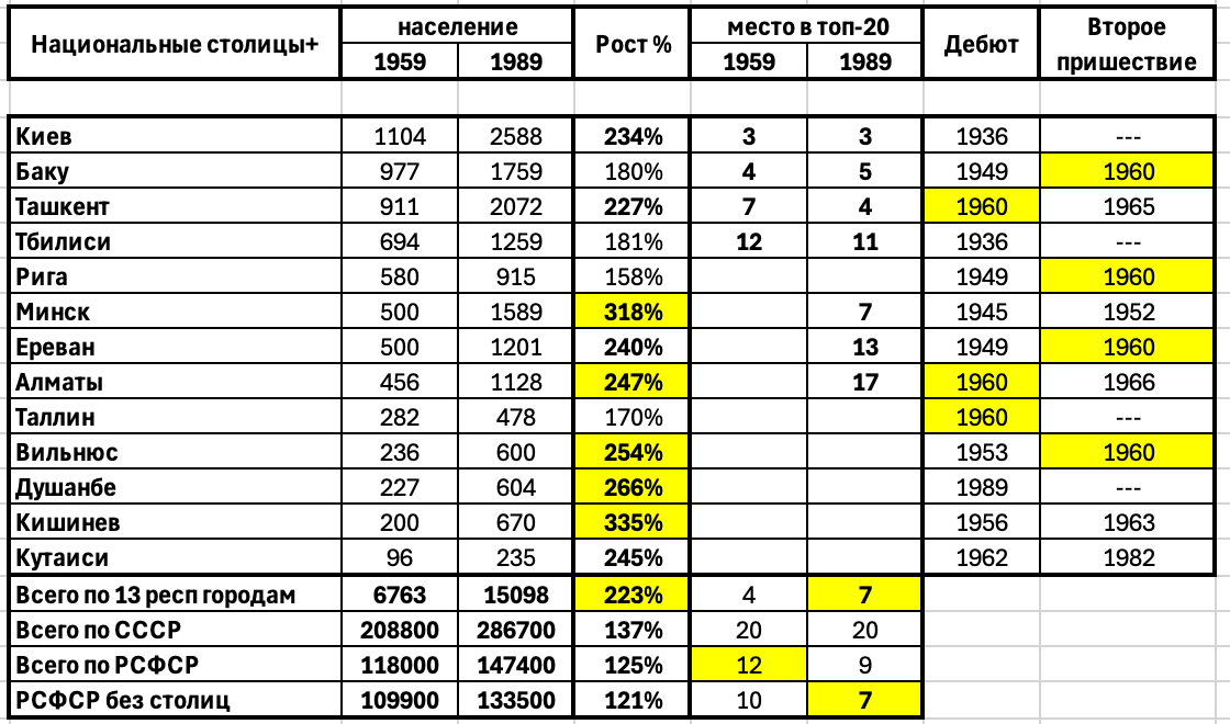 Понятно в большинстве республик была еще и выше рождаемость чем в РСФСР – этот тренд начался еще в 30-х – но столицы самых рождающих стран – Баку и Тбилиси выросли не так сильно – только на 80%, тогда как Киев, Вильнюс, Минск и Алматы имели рождаемость ниже среднесоюзной, но выросли в 2-3 раза в основном за счет миграции из РСФСР по распределению из российских вузов, отчего к 1989 году в этих городах русскоговорящее население стало сильно доминировать над местным. В Ташкенте и Ереване не доминировало – но тоже имело очень высокий процент.