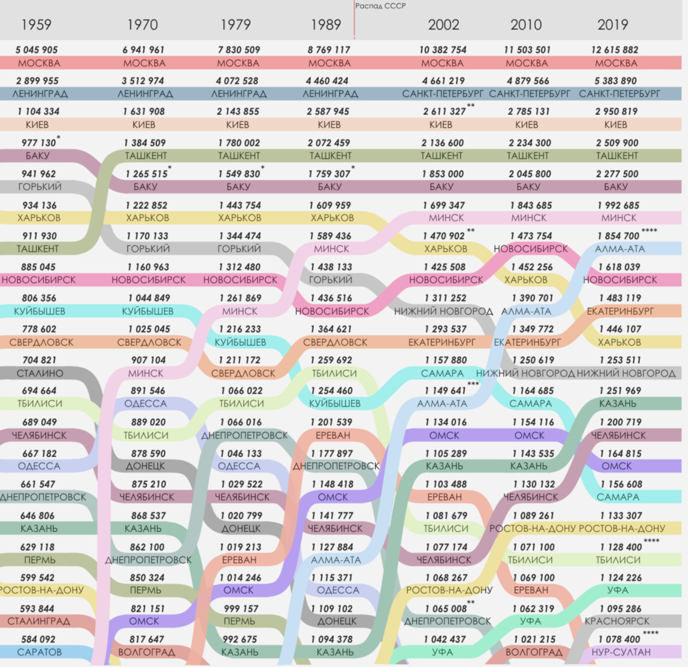Если посмотреть переписи населения СССР 1959-1989 года то мы увидим там следующие крупнейшие города.