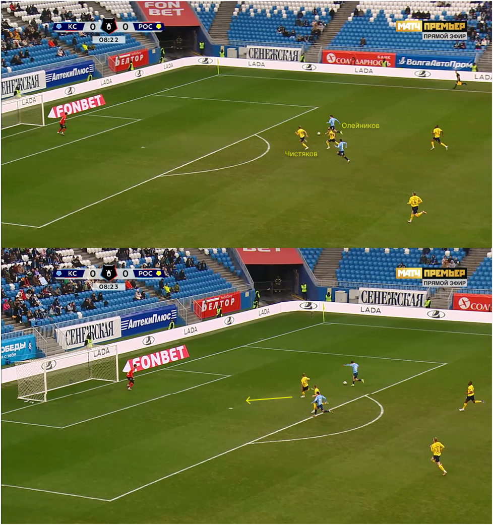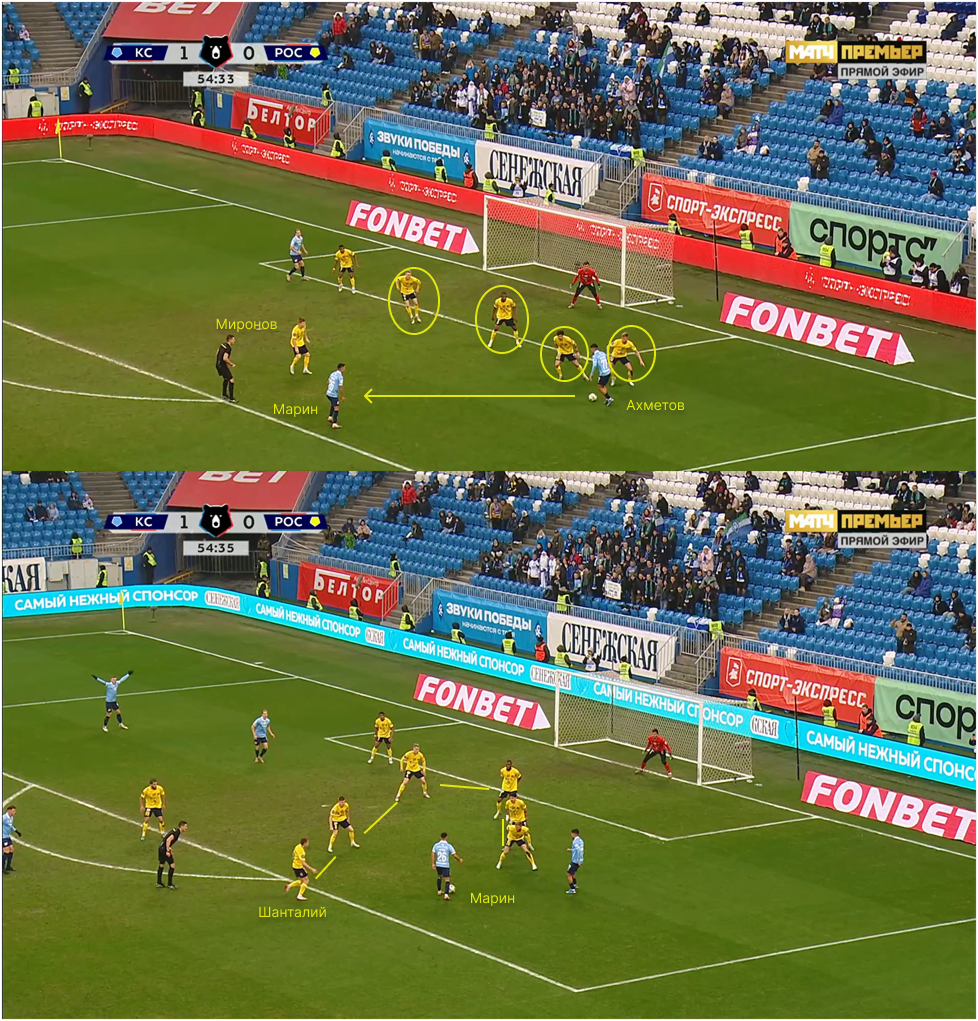 Хотя изначально в штрафной «Ростова» было всего 3 игрока «Крыльев» (фактически – два, передача на дальнюю штангу на Кирилла Печенина в теории никак не проходила) – против шести. Илья Вахания, Чистяков, Сако, Виктор Мелехин и Алексей Миронов защищались чисто символически: пытались заблокировать удар, не выдвигаясь на соперника. В итоге Ахметов сделал 7 касаний перед тем, как откатить Марину. А нападающий «Крыльев» пробил только третьим касанием.