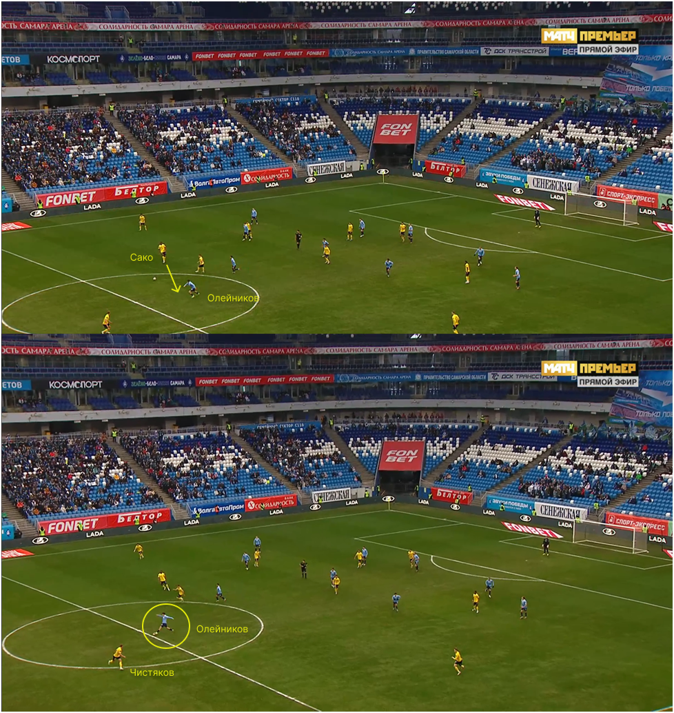 Обрез Сако только полбеды. Главный вопрос: что делал дальше Чистяков? Центральный защитник бежал параллельно Олейникову. Вместо того, чтобы блокировать, убежал в другую сторону.