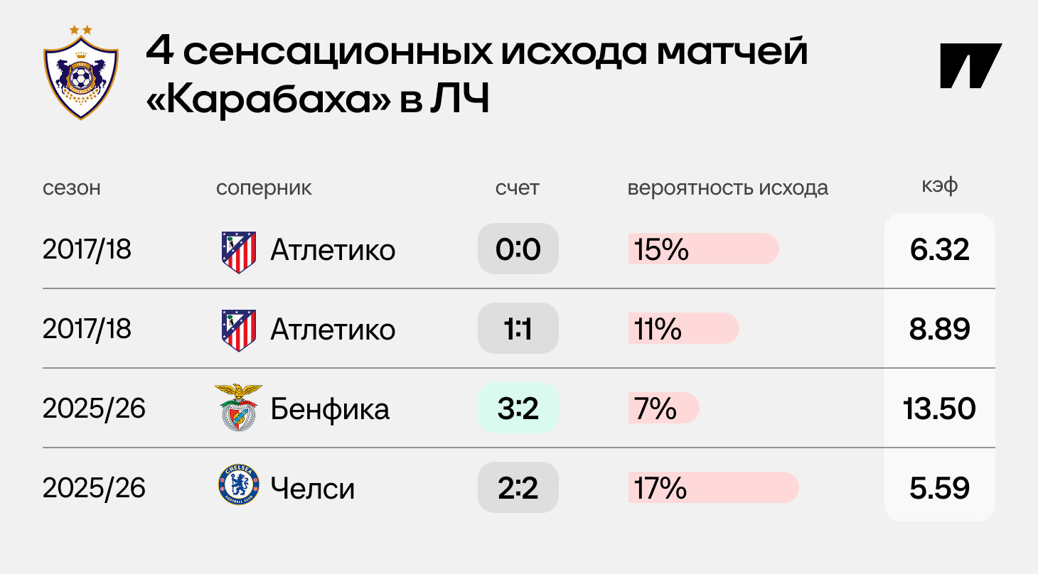 «Карабах» сыграл в ЛЧ десять матчей. В сезоне-2017/18 было шесть против «Атлетико», «Челси» и «Ромы», сейчас – еще четыре против «Бенфики», «Копенгагена», «Атлетика» и «Челси».