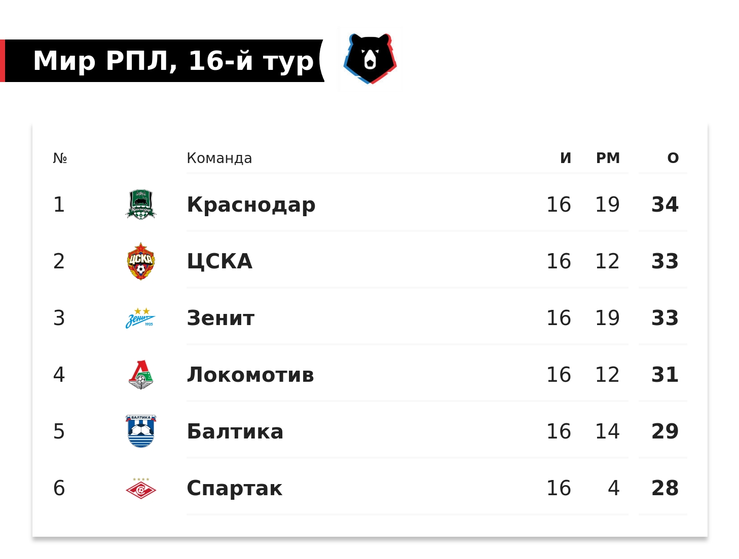 После 16 туров Мир РПЛ в лидирующей группе очень плотно: всего несколько очков между командами в топ-4: лишь три от четвертого места до первого!