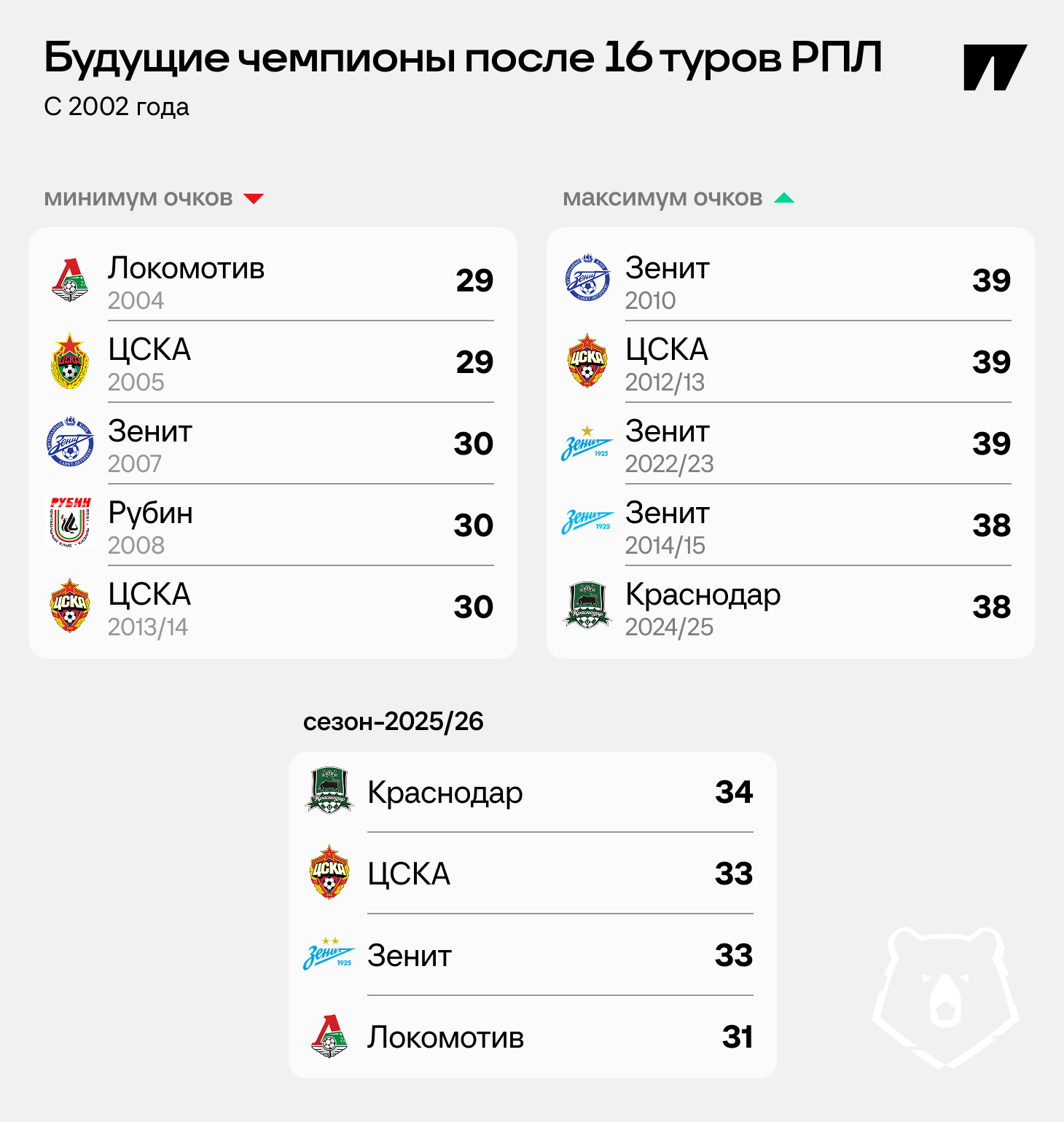 Если взять 22 сезона – с 2002 года и за исключением переходного-2011/12 – то в среднем будущий чемпион набирал 34 очка по итогам 16 туров. «Краснодар» идет ровно по этому графику, «Зенит» и ЦСКА совсем минимально отстают, «Локо» – рядом.