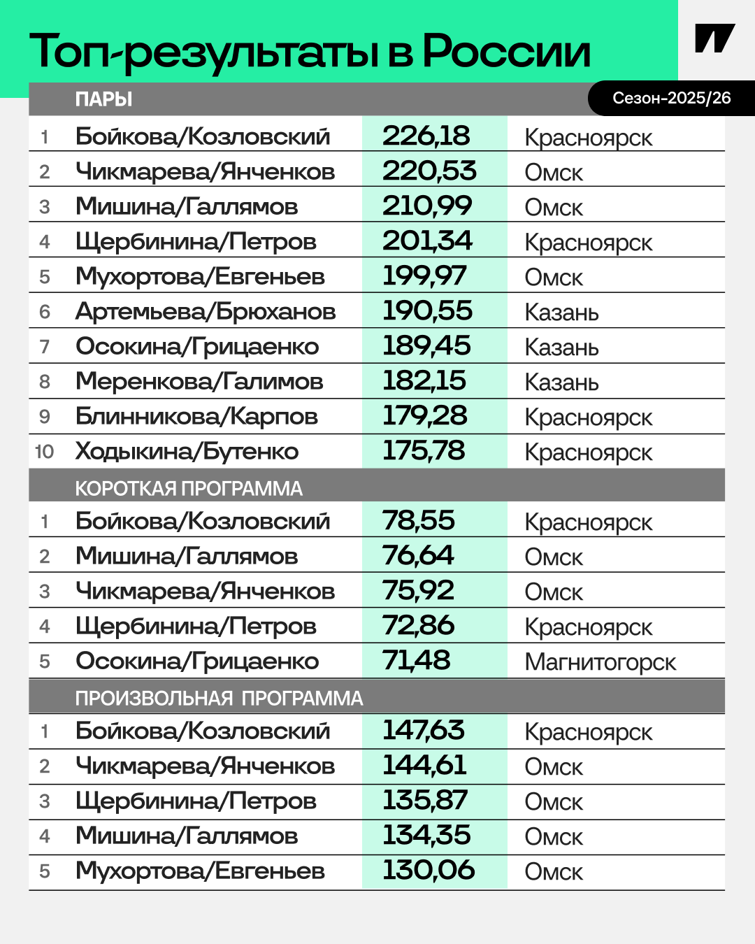 В Омске Мишина с Галлямовым проиграли даже Екатерине Чикмаревой и Матвею Янченкову, которые не выступали больше года, но теперь воспользовались паузой в выступлениях пар Ясмина Кадырова – Илья Миронов и Наталья Хабибуллина – Илья Княжук, чтобы ворваться в топ-3 и даже претендовать на большее.