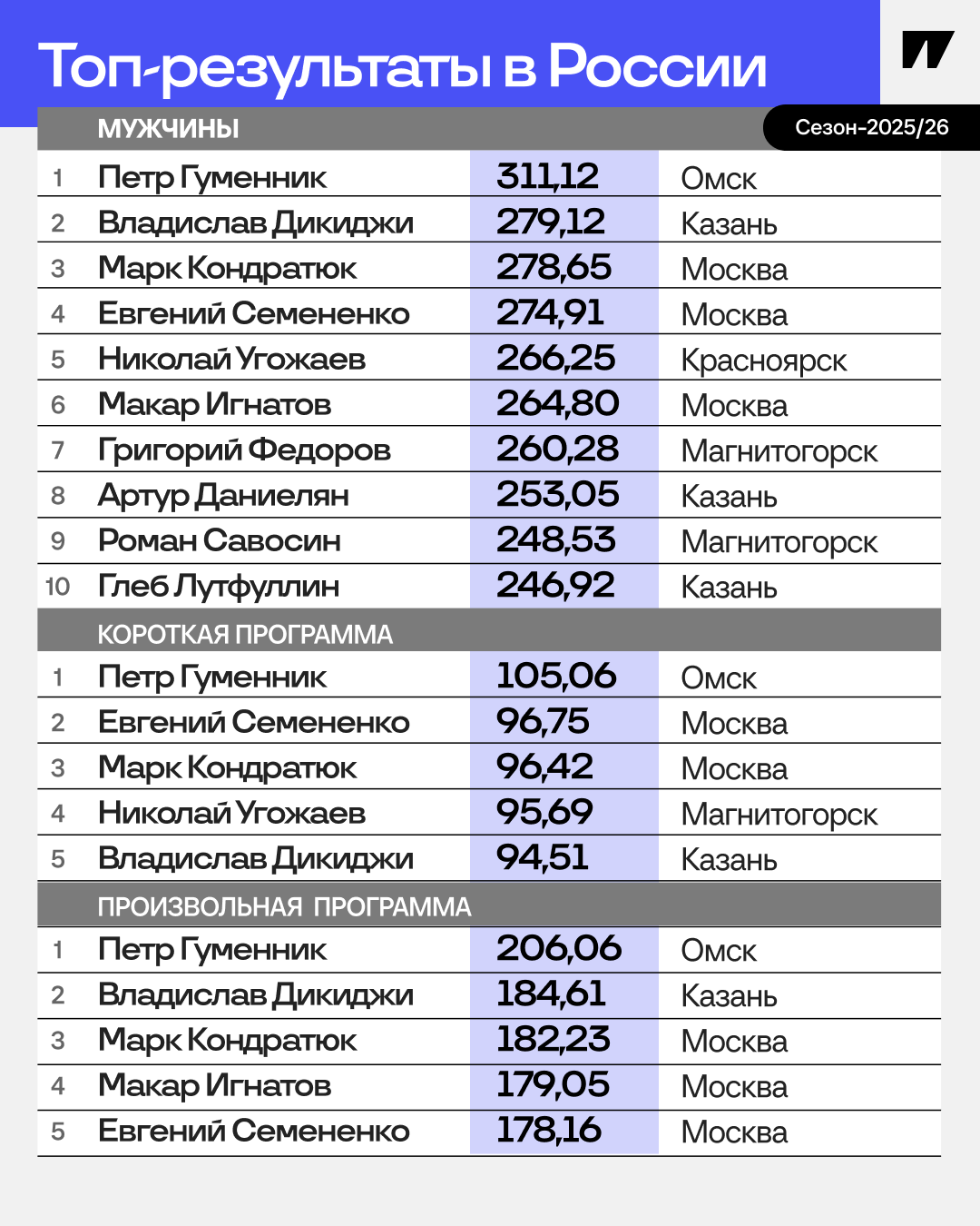 Благодаря Гуменнику мужская фигурка заметно расслоилась: если год назад лучший и десятый результаты сезона разделяли 30 баллов, то теперь этот разрыв вырос до гигантских 65 баллов.