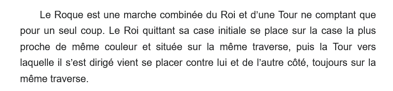 Перевод с французского: «Рокировка — комбинация хода короля и ладьи, делающаяся за один ход. Король, покидая свою начальную клетку, встаёт на ближайшую клетку того же цвета, находящуюся на той же горизонтали. Далее ладья, в сторону которой он сдвинулся, встаёт рядом с ним с другой стороны всё ещё по той же горизонтали».