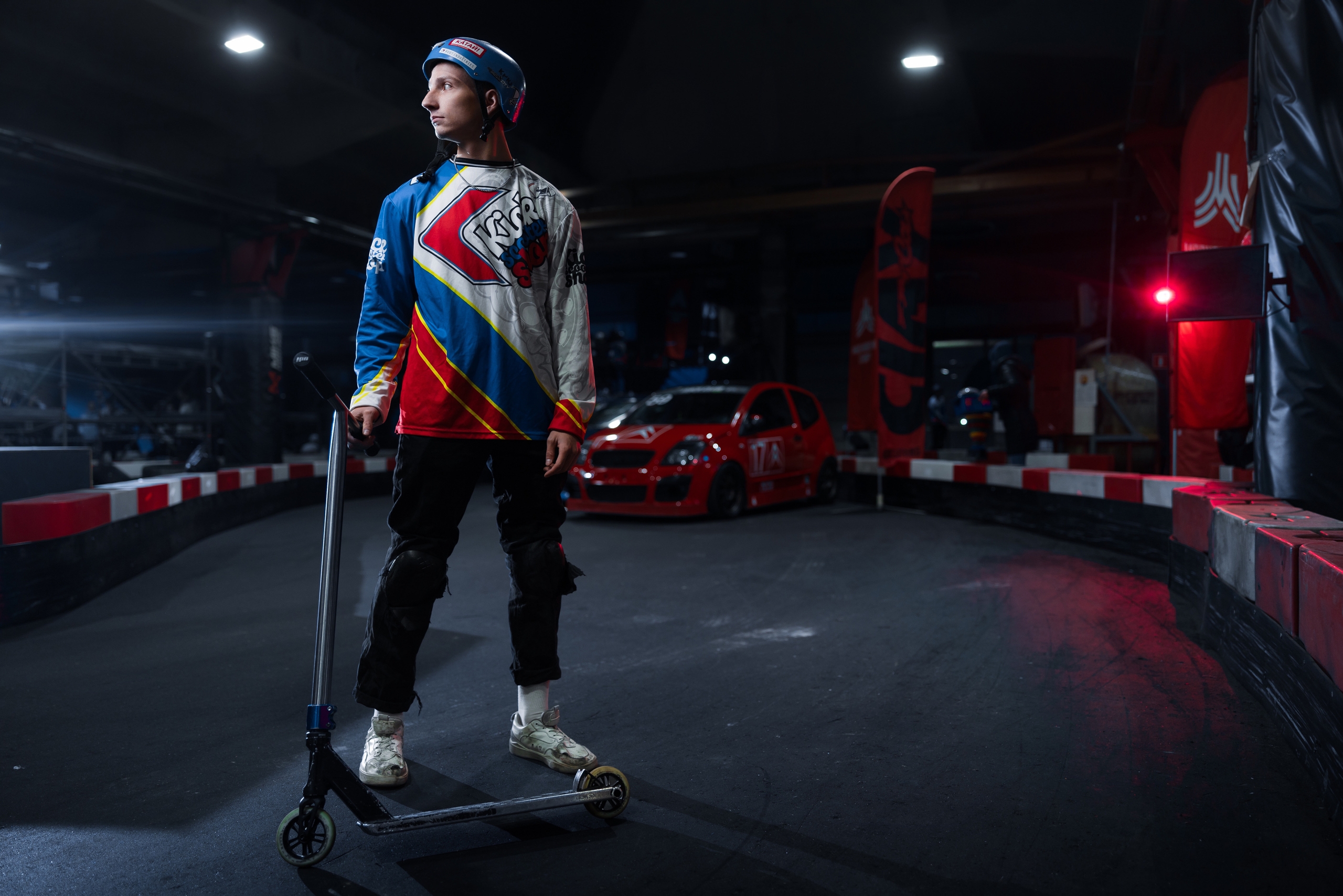 Я захожу на территорию крытого скейт-парка на Нагорной. Время — 13:00. Меня встречает Стас — невысокий парень в спортивной форме и кедах. Мы надеваем шлем и наколенники, берем самокаты и начинаем тренировку.