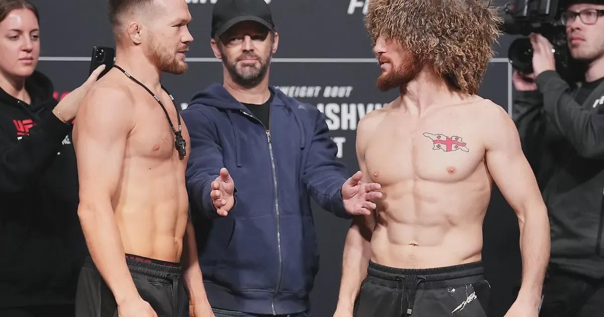 По росту и размаху бойцы почти равны. Разница не в габаритах, а в подходе. Ян - ударник высокого уровня: сильный бокс, плотные комбинации, грамотная защита. А стиль Двалишвили - это давление, борьба, темп, постоянные попытки перевести или прижать к сетке.