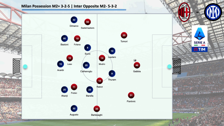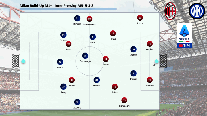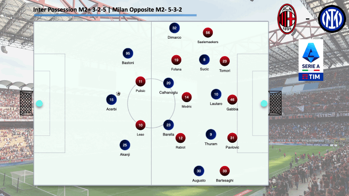 Первый тайм начался спокойно и непринуждённо: «Интер» не отказался от привычного билд-апа и структуры, где главные флюиды продвижения – Чалханоглу и Барелла. При начале атак Хакан опускался ниже, почти на линию защитников, что позволяло Бастони подниматься выше, иногда даже в роль фулбека. Димарко уходил в полуфланг, создавая дополнительную ширину. «Милан» выстраивался в строгий средний и низкий блок 5-3-2, оставляя для переходов Пулишича и Леау. Такая схема владения «Интера» даёт одного лишнего игрока в атаке (6 в 5), но любая потеря оставляет огромные зоны для ускорения. Однако «Милан» не нагнетал – блок был структурный, но без агрессии во второй зоне.