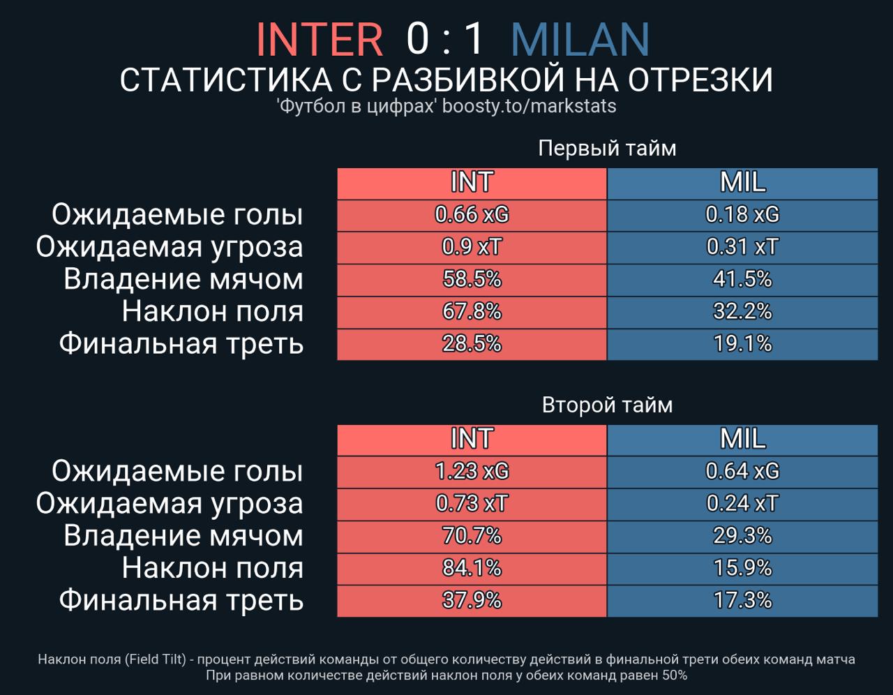Иронично, но гол пришёл откуда не ждали. «Интер» выполнял длинный заброс (редкий случай), казалось, уже выиграл подбор, но впервые за матч возникла атака 3 в 3, и «Милан» забил. А дальше у Аллегри появился полный карт-бланш на автобус и отказ от владения. «Интер» завелся, пошел давить и раскрыл всю силу на флангах. Прокол Хакана на пенальти, пассивность Лаутаро в штрафной не впечатлили Киву и пошли замены. Чуть позже ушёл и Барелла. Но было ощущения, что сценарий и счет матча уже закрепился.