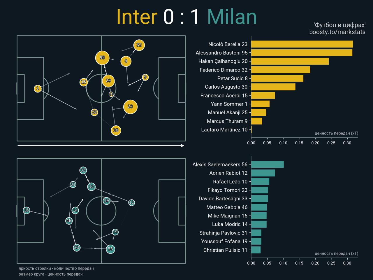 По цифрам картина очень даже жёсткая: xG 1.88 против 0.82, владение 63.8% против 36.2%, удары 20 против 7, Field Tilt 76.9% против 23.1%, xThreat 2.35 против 0.59, но при этом «Милан» нанёс 2 удара после контратак, а «Интер» – ноль. И оба опаснейших момента гостей пришли именно из переходов. «Интер» контролировал всё, кроме самого важного — результата.