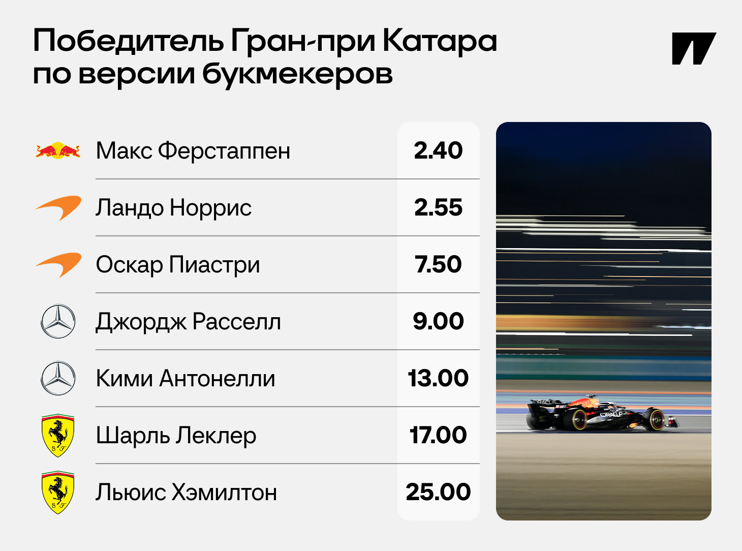 В этот раз в Катаре очень высоко оценивают шансы «Мерседеса». Джордж Расселл стоит четвертым с вероятностью победы выше 10%. Андреа Кими Антонелли получил 13.00, хотя еще недавно его первые места оценивались от 60.00.