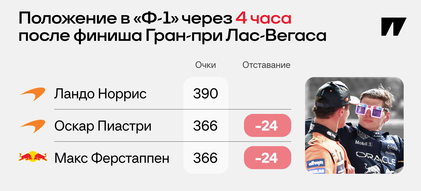 Чемпионская интрига в «Ф-1» взбодрилась благодаря технической ошибке «Макларена» в Лас-Вегасе: лидера подбили за нарушение регламента. Подробно командную ошибку разбирали в отдельном материале.