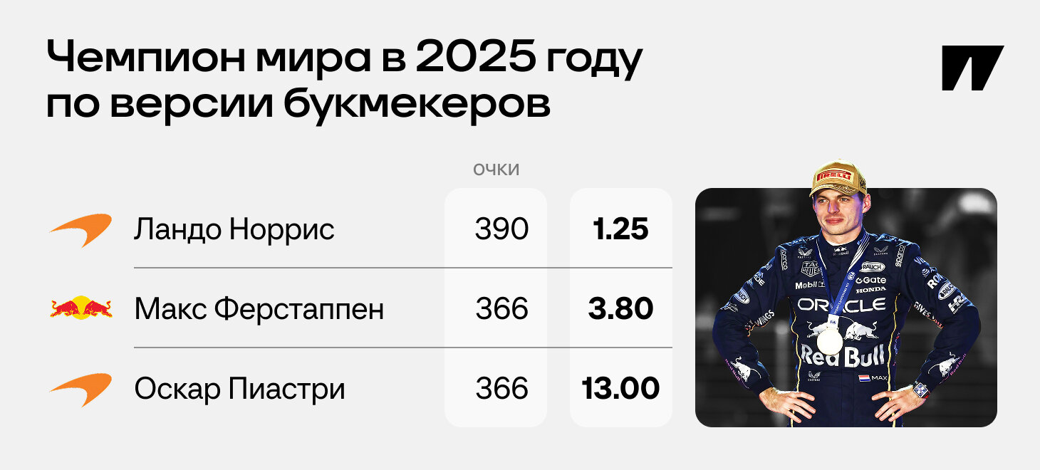 Любопытно, что Пиастри совсем списали, хотя он выходит на два финальных Гран-при с равным количеством очков с Ферстаппеном. У австралийца кошмарная динамика: шесть больших гонок без подиума, регулярные провалы в квалификациях. Отсюда и коэффициент 13.00 на титул – Оскара не считают реальным претендентом.