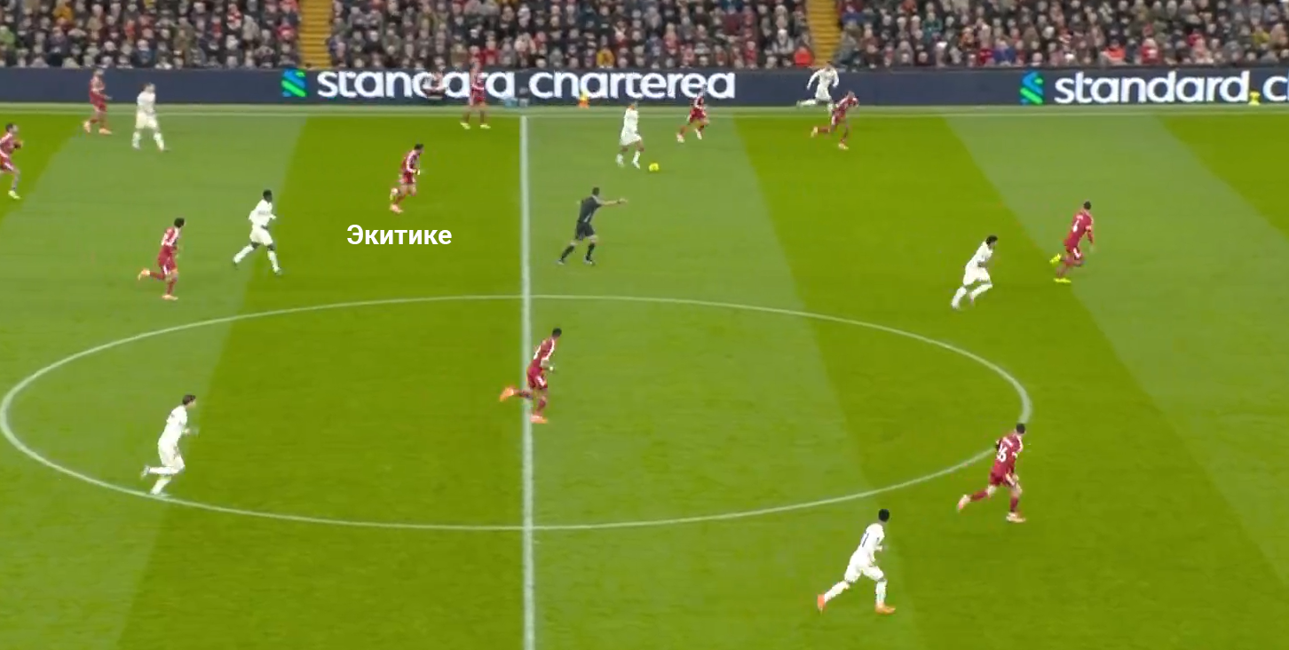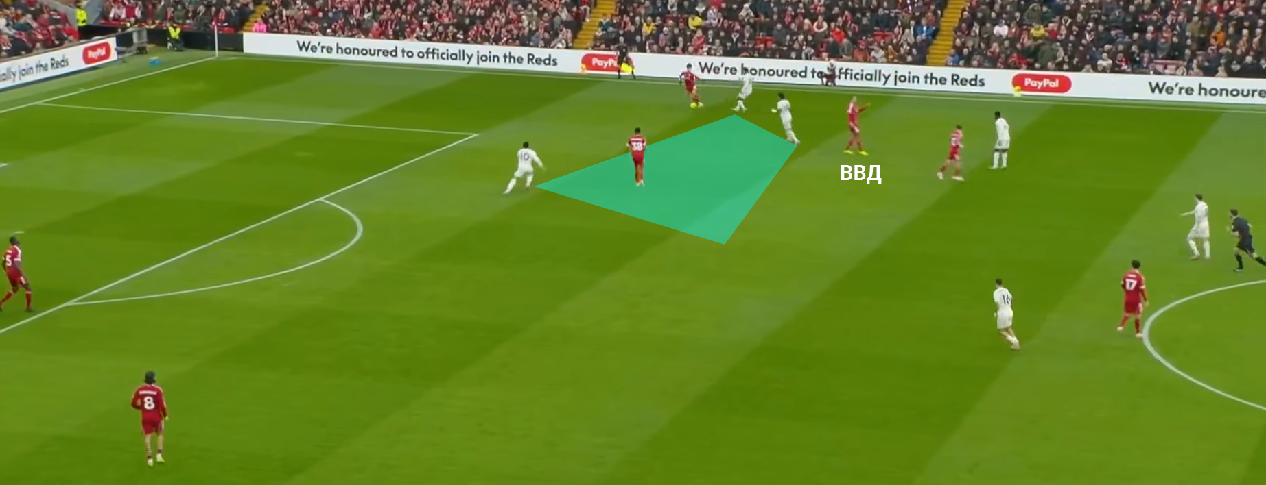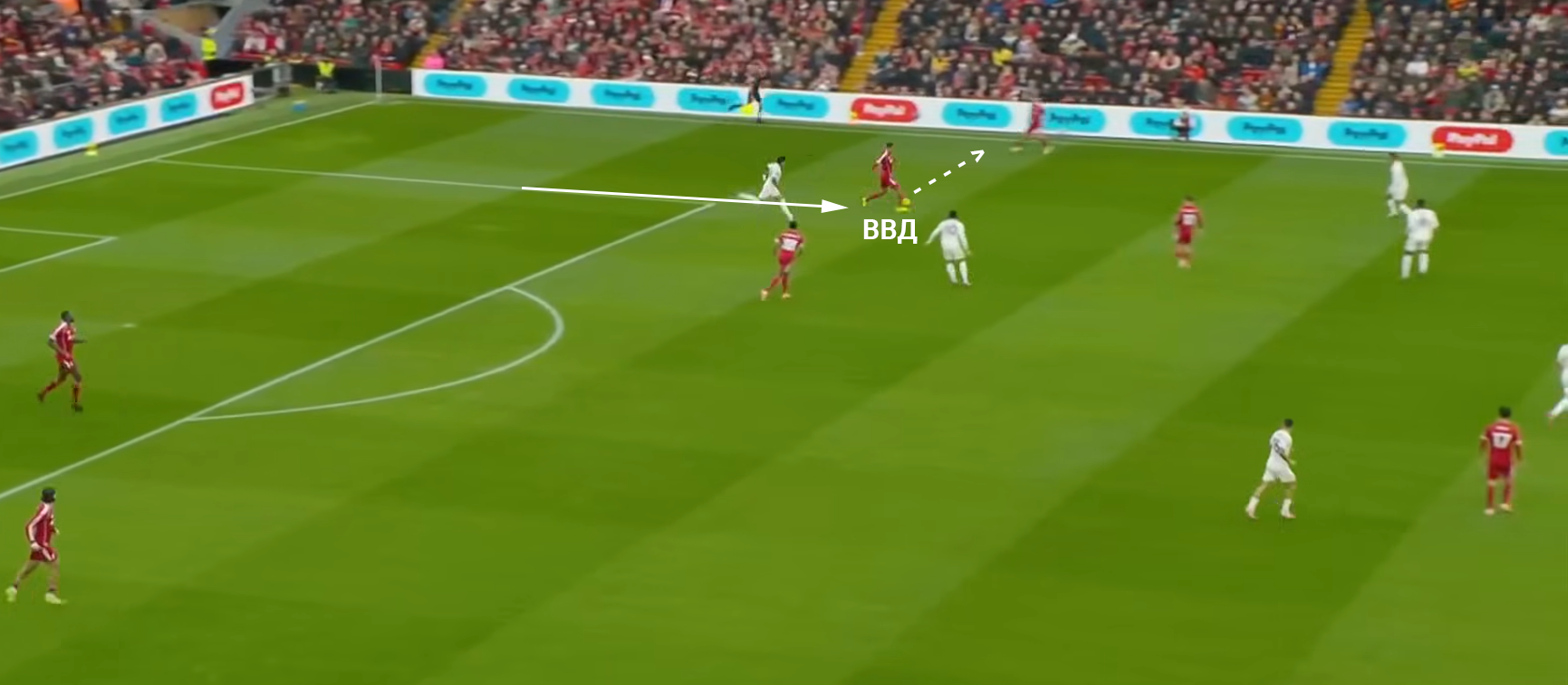 Я понимаю эту ротацию: центральный защитник в лице Ван Дейка тащит мяч, скидывает на крайнего защитника и сам немного продолжает идти вперед и остается в опорной. Так защитник уводит нападающего и создает небольшую зону Керкезу (кз) для паса или захода внутрь опорной, где кста хорошо открыта дальняя нога Гравенберха (Керкез отдаст пас назад вратарю).